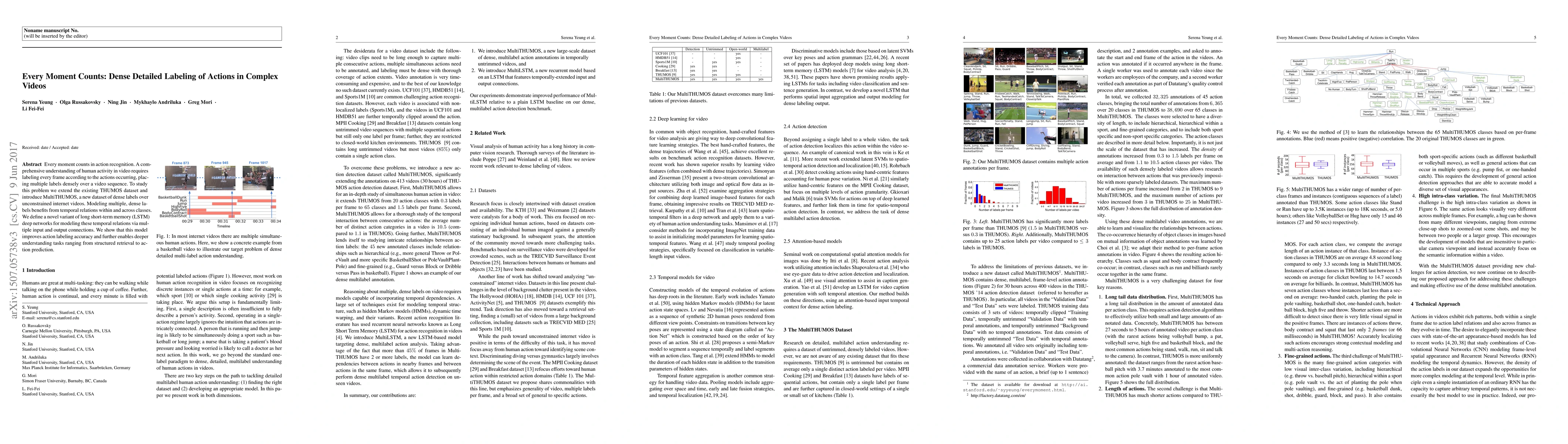 Every moment counts in action recognition. A comprehensive understanding of human activity in video requires labeling every frame according to the actions occurring, placing multiple labels densely over a video sequence. To study this problem we extend the existing THUMOS dataset and introduce MultiTHUMOS, a new dataset of dense labels over unconstrained internet videos. Modeling multiple, dense labels benefits from temporal relations within and across classes. We define a novel variant of long short-term memory (LSTM) deep networks for modeling these temporal relations via multiple input and output connections. We show that this model improves action labeling accuracy and further enables deeper understanding tasks ranging from structured retrieval to action prediction.