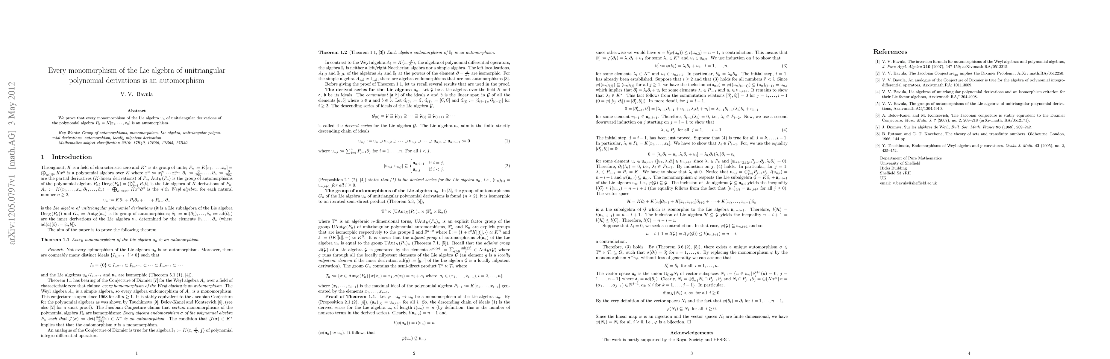 We prove that every monomorphism of the Lie algebra $\ggu_n$ of unitriangular derivations of the polynomial algebra $P_n=K[x_1,..., x_n]$ is an automorphism.