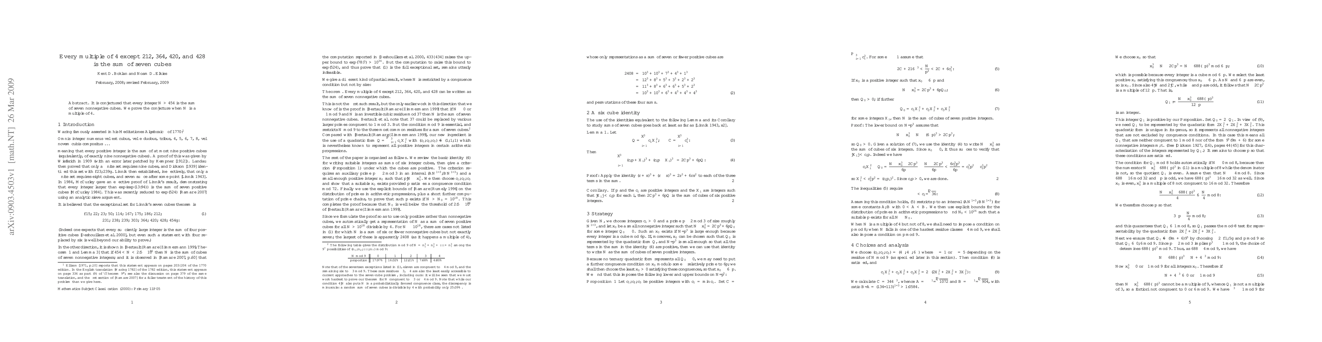 It is conjectured that every integer N>454 is the sum of seven nonnegative cubes. We prove the conjecture when N is a multiple of 4.