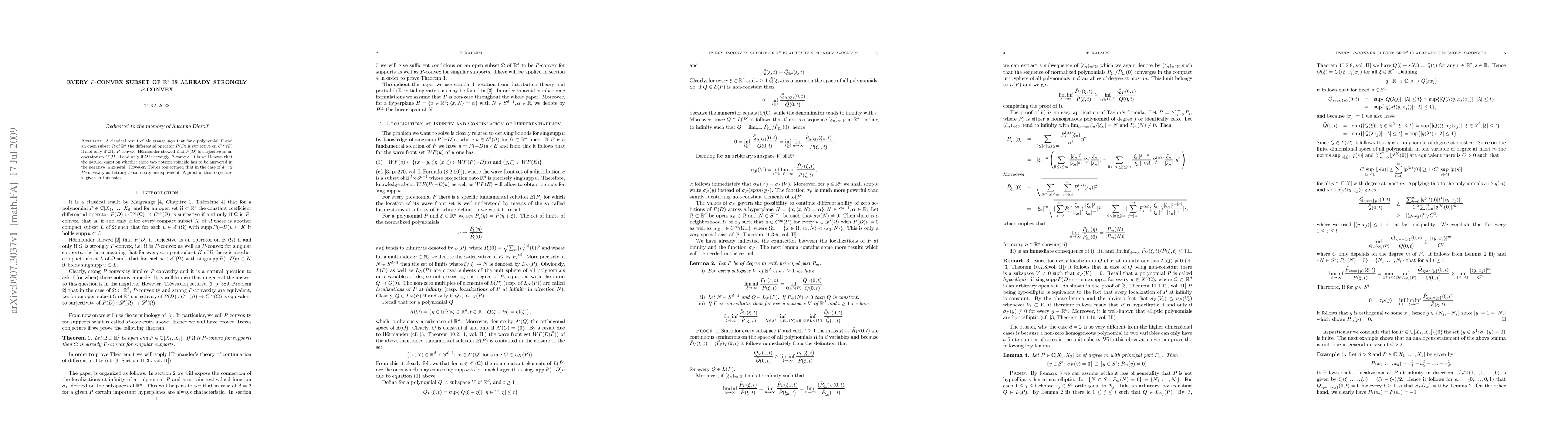 A classical result of Malgrange says that for a polynomial P and an open subset $\Omega$ of $\R^d$ the differential operator $P(D)$ is surjective on $C^\infty(\Omega)$ if and only if $\Omega$ is P-convex. H\"ormander showed that $P(D)$ is surjective as an operator on $\mathscr{D}'(\Omega)$ if and only if $\Omega$ is strongly P-convex. It is well known that the natural question whether these two notions coincide has to be answered in the negative in general. However, Tr\`eves conjectured that in the case of d=2 P-convexity and strong P-convexity are equivalent. A proof of this conjecture is given in this note.