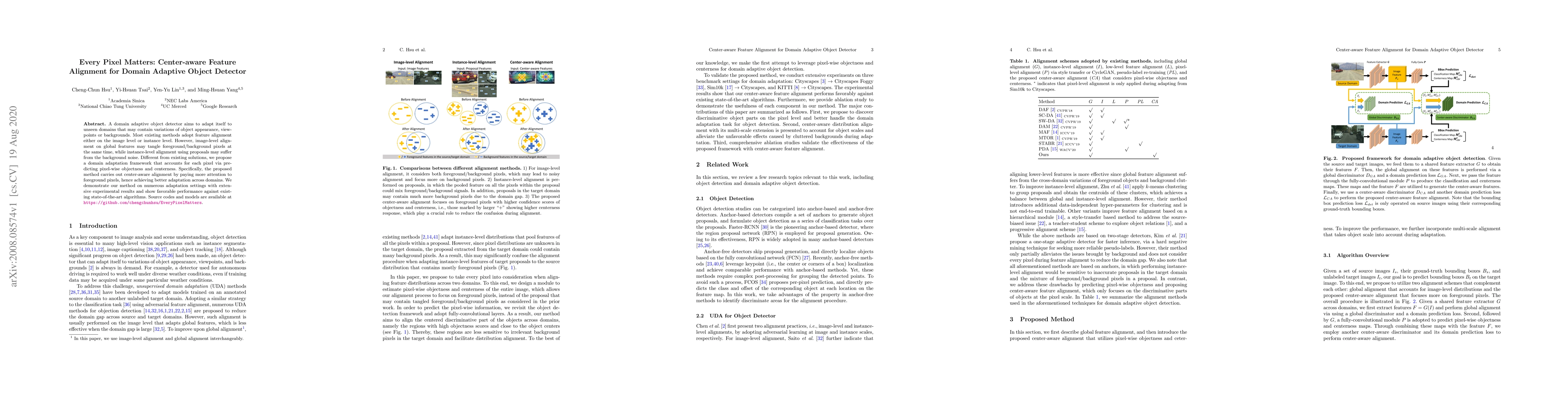This paper proposes a domain adaptive object detector that enhances feature alignment by focusing on pixel-wise objectness and centerness, achieving better adaptation across domains compared to global or instance-level alignment methods. The method demonstrates superior performance in various adaptation settings.