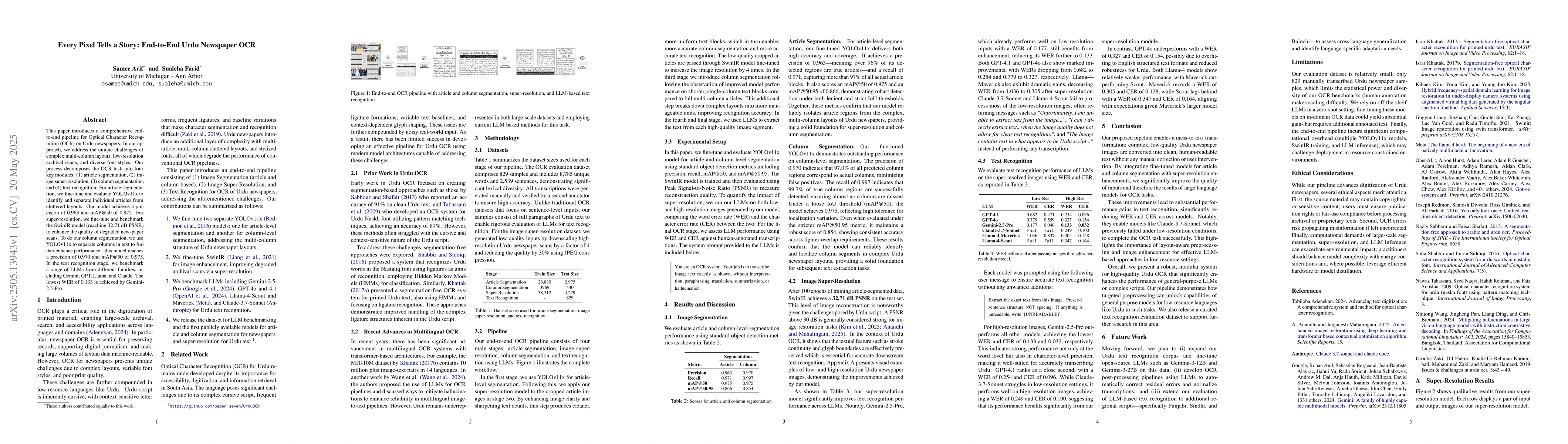 This paper introduces a comprehensive end-to-end pipeline for Optical Character Recognition (OCR) on Urdu newspapers. In our approach, we address the unique challenges of complex multi-column layouts, low-resolution archival scans, and diverse font styles. Our process decomposes the OCR task into four key modules: (1) article segmentation, (2) image super-resolution, (3) column segmentation, and (4) text recognition. For article segmentation, we fine-tune and evaluate YOLOv11x to identify and separate individual articles from cluttered layouts. Our model achieves a precision of 0.963 and mAP@50 of 0.975. For super-resolution, we fine-tune and benchmark the SwinIR model (reaching 32.71 dB PSNR) to enhance the quality of degraded newspaper scans. To do our column segmentation, we use YOLOv11x to separate columns in text to further enhance performance - this model reaches a precision of 0.970 and mAP@50 of 0.975. In the text recognition stage, we benchmark a range of LLMs from different families, including Gemini, GPT, Llama, and Claude. The lowest WER of 0.133 is achieved by Gemini-2.5-Pro.