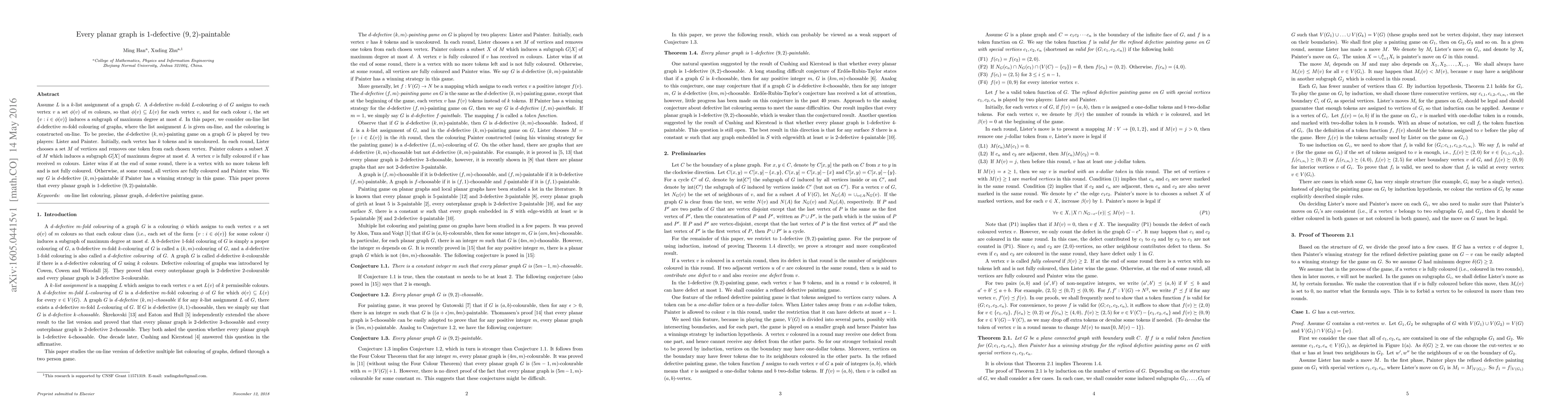 Assume $L$ is a $k$-list assignment of a graph $G$. A $d$-defective $m$-fold $L$-colouring $\phi$ of $G$ assigns to each vertex $v$ a set $\phi(v)$ of $m$ colours, so that $\phi(v) \subseteq L(v)$ for each vertex $v$, and for each colour $i$, the set $\{v: i \in \phi(v)\}$ induces a subgraph of maximum degree at most $d$. In this paper, we consider on-line list $d$-defective $m$-fold colouring of graphs, where the list assignment $L$ is given on-line, and the colouring is constructed on-line. To be precise, the $d$-defective $(k,m)$-painting game on a graph $G$ is played by two players: Lister and Painter. Initially, each vertex has $k$ tokens and is uncoloured. In each round, Lister chooses a set $M$ of vertices and removes one token from each chosen vertex. Painter colours a subset $X$ of $M$ which induces a subgraph $G[X]$ of maximum degree at most $d$. A vertex $v$ is fully coloured if $v$ has received $m$ colours. Lister wins if at the end of some round, there is a vertex with no more tokens left and is not fully coloured. Otherwise, at some round, all vertices are fully coloured and Painter wins. We say $G$ is $d$-defective $(k,m)$-paintable if Painter has a winning strategy in this game. This paper proves that every planar graph is $1$-defective $(9,2)$-paintable.