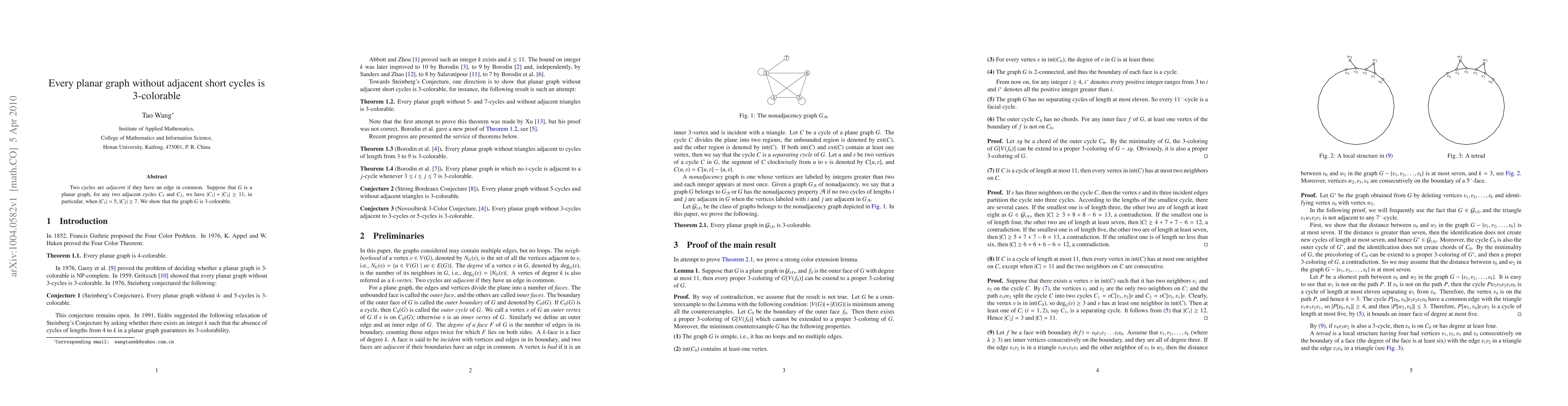 A planar graph without adjacent short cycles can be 3-colored due to a specific constraint on cycle lengths, ensuring that no two cycles share an edge with lengths of 5 or less.