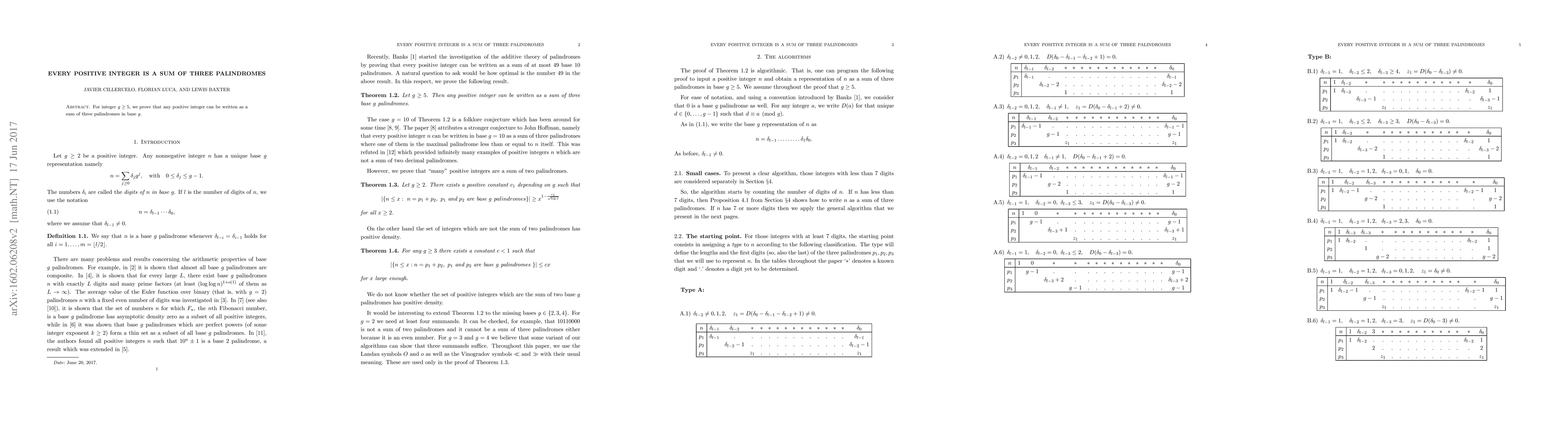 Summary: This paper proves that any positive integer can be expressed as the sum of three palindromic numbers in base $g$ for $g \ge 5$. The study focuses on the structural properties of palindromes and their combinatorial representation in different bases.