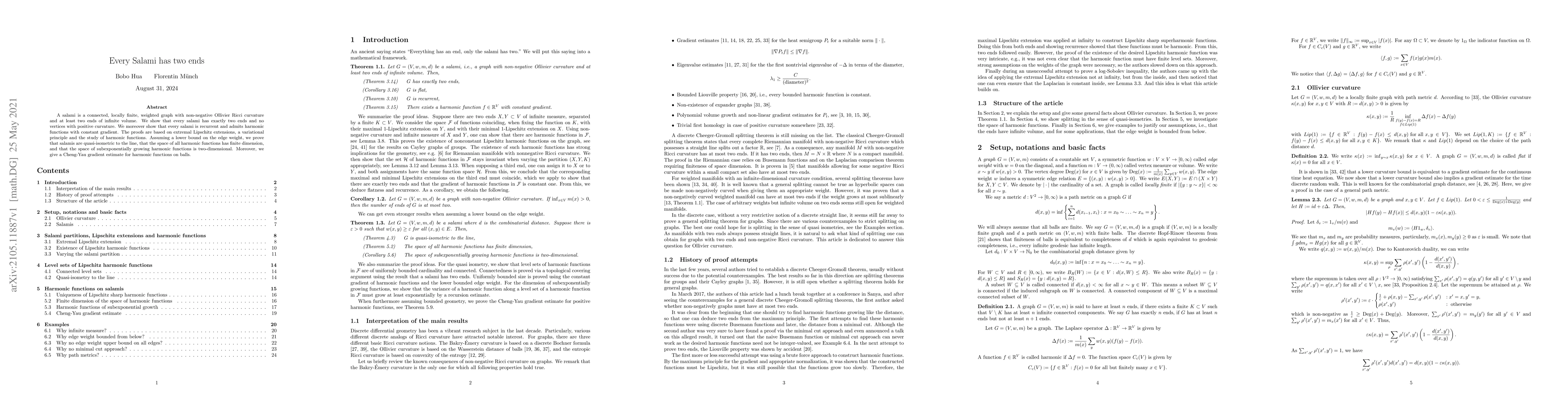 The paper proves that every salami graph has exactly two ends and no vertices with positive curvature, showing it is recurrent and admits harmonic functions with constant gradient.
