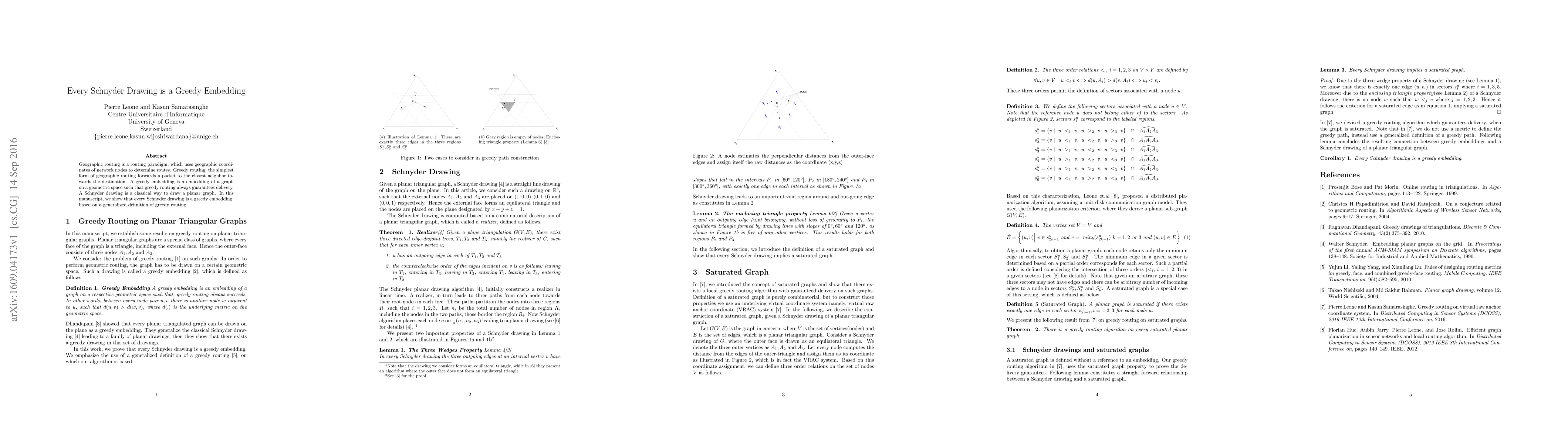 Geographic routing is a routing paradigm, which uses geographic coordinates of network nodes to determine routes. Greedy routing, the simplest form of geographic routing forwards a packet to the closest neighbor towards the destination. A greedy embedding is a embedding of a graph on a geometric space such that greedy routing always guarantees delivery. A Schnyder drawing is a classical way to draw a planar graph. In this manuscript, we show that every Schnyder drawing is a greedy embedding, based on a generalized definition of greedy routing.