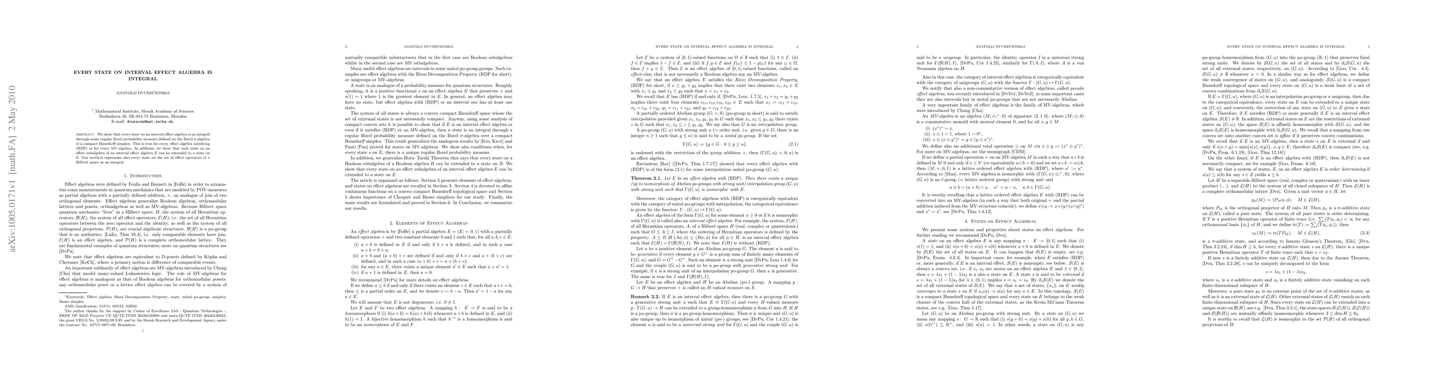 We show that every state on an interval effect algebra is an integral through some regular Borel probability measure defined on the Borel $\sigma$-algebra of a compact Hausdorff simplex. This is true for every effect algebra satisfying (RDP) or for every MV-algebra. In addition, we show that each state on an effect subalgebra of an interval effect algebra $E$ can be extended to a state on $E.$ Our method represents also every state on the set of effect operators of a Hilbert space as an integral