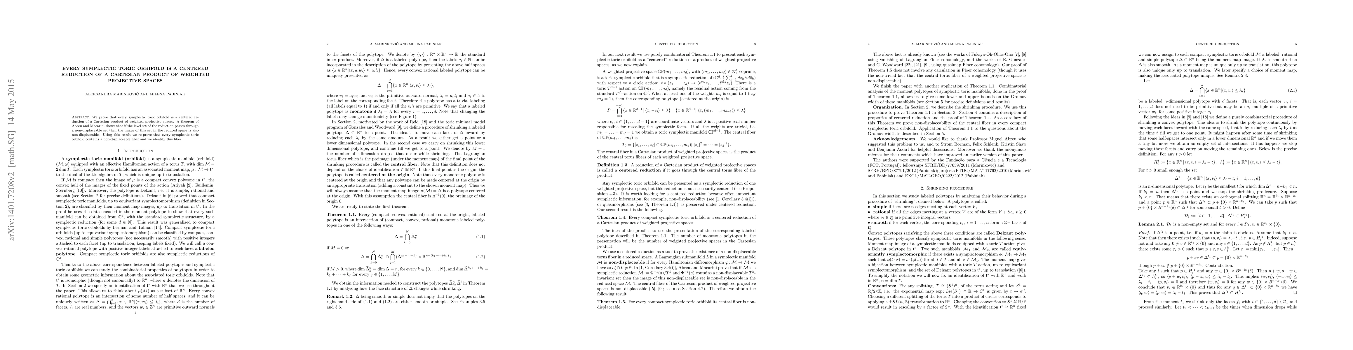 We prove that every symplectic toric orbifold is a centered reduction of a Cartesian product of weighted projective spaces. A theorem of Abreu and Macarini shows that if the level set of the reduction passes through a non-displaceable set then the image of this set in the reduced space is also non-displaceable. Using this result we show that every symplectic toric orbifold contains a non-displaceable fiber and we identify this fiber.