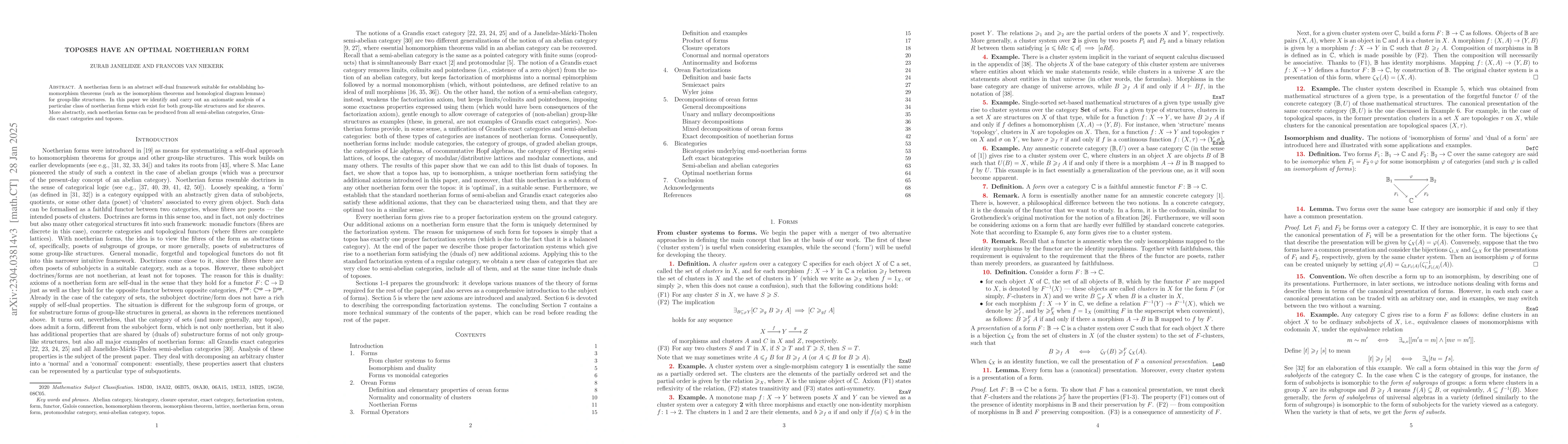 This paper demonstrates that every topos can be characterized as an optimal noetherian form, a generalization of an abelian category that accommodates non-abelian algebraic structures. It reveals an intrinsic connection between these noetherian forms and semi-abelian categories, showing an unexpected equivalence for pointed categories with finite products and sums.