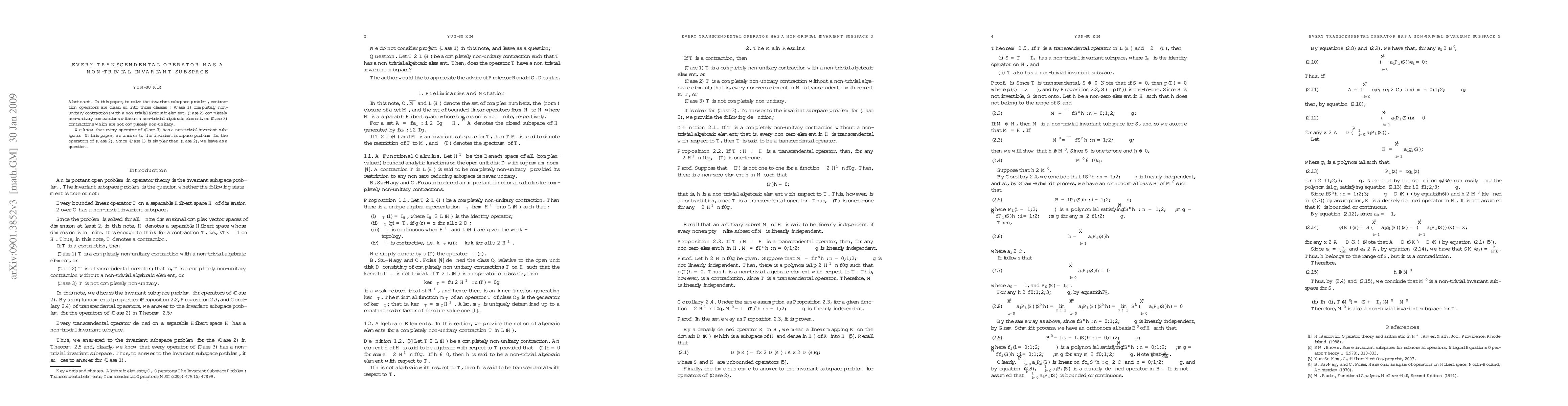 In this paper, to solve the invariant subspace problem, contraction operators are classified into three classes ; (Case 1) completely non-unitary contractions with a non-trivial algebraic element, (Case 2) completely non-unitary contractions without a non-trivial algebraic element, or (Case 3) contractions which are not completely non-unitary. We know that every operator of (Case 3) has a non-trivial invariant subspace. In this paper, we answer to the invariant subspace problem for the operators of (Case 2). Since (Case 1) is simpler than (Case 2), we leave as a question.