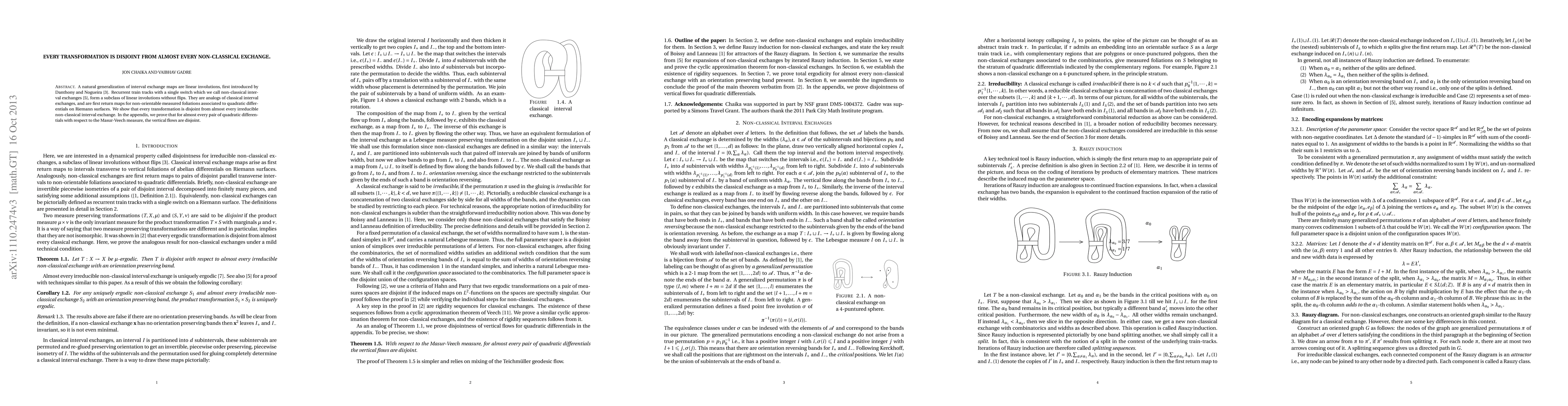 This paper demonstrates that every transformation is disjoint from almost every irreducible non-classical interval exchange, a subclass of linear involutions. An appendix proves that vertical flows for almost every pair of quadratic differentials are disjoint with respect to the Masur-Veech measure.