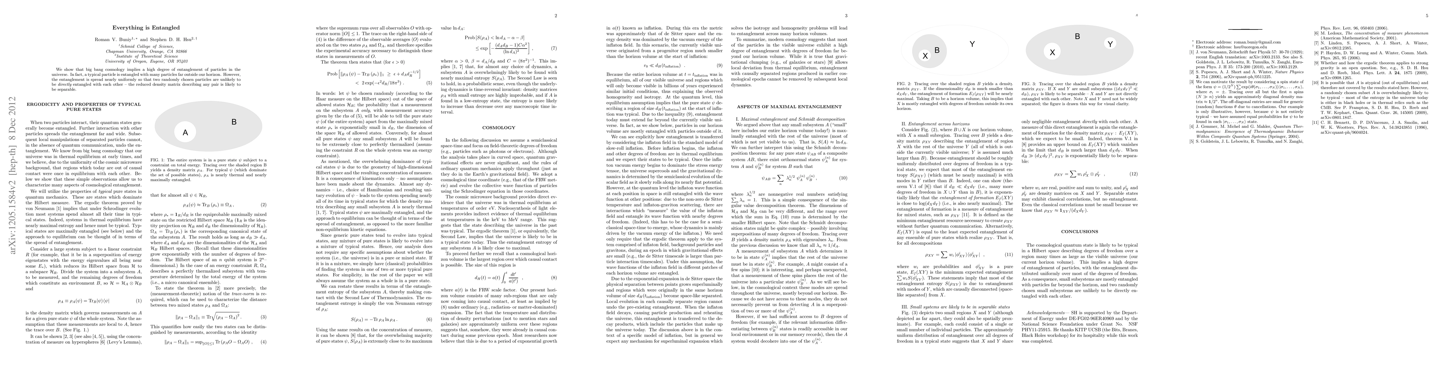We show that big bang cosmology implies a high degree of entanglement of particles in the universe. In fact, a typical particle is entangled with many particles far outside our horizon. However, the entanglement is spread nearly uniformly so that two randomly chosen particles are unlikely to be directly entangled with each other -- the reduced density matrix describing any pair is likely to be separable.