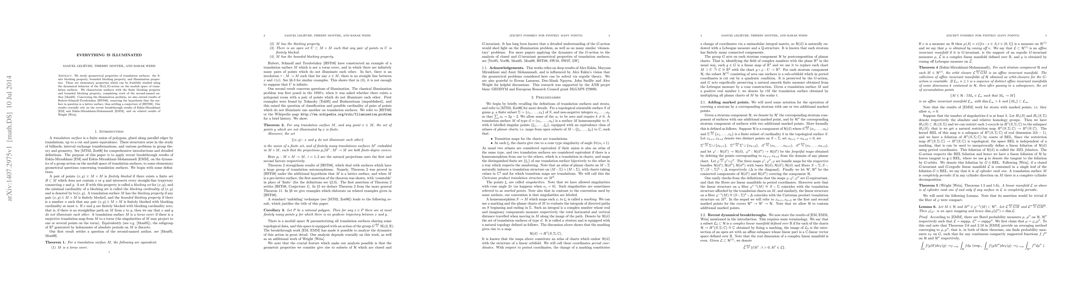 We study geometrical properties of translation surfaces: the finite blocking property, bounded blocking property, and illumination properties. These are elementary properties which can be fruitfully studied using the dynamical behavior of the SL(2,R)-action on the moduli space of translation surfaces. We characterize surfaces with the finite blocking property and bounded blocking property, completing work of the second-named author. Concerning the illumination problem, we also extend results of Hubert-Schmoll-Troubetzkoy, removing the hypothesis that the surface in question is a lattice surface, thus settling a conjecture. Our results crucially rely on the recent breakthrough results of Eskin-Mirzakhani and Eskin-Mirzakhani-Mohammadi, and on related results of Wright.