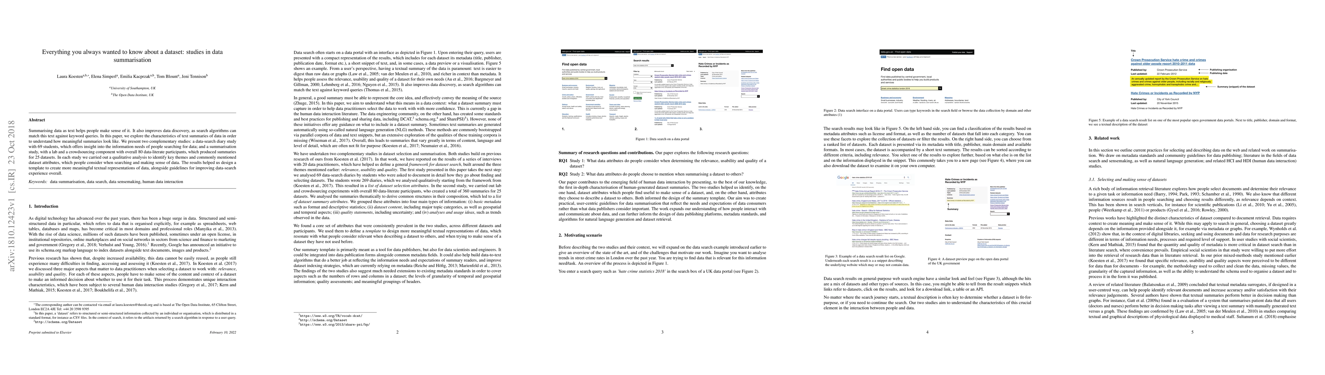 This research highlights the importance of considering human factors in dataset summarization to improve usability and accessibility.