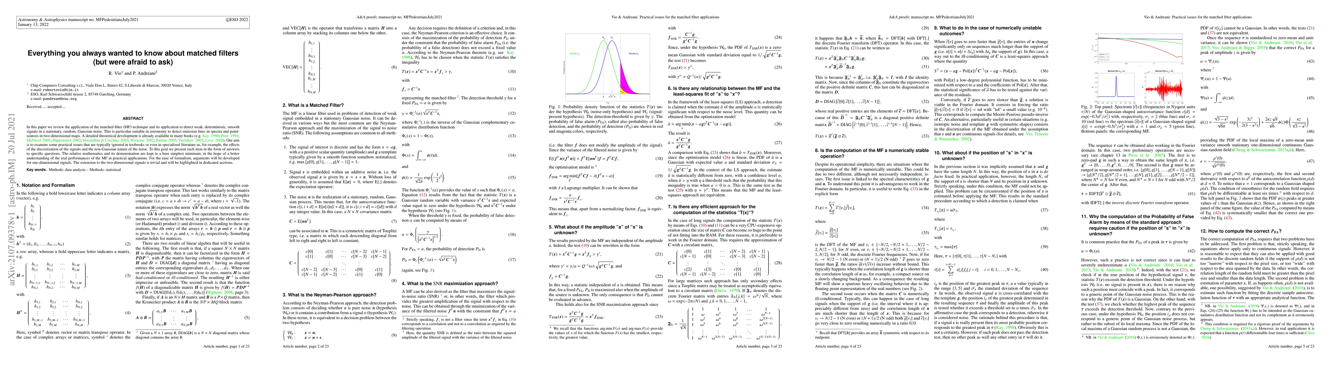 This paper reviews matched filter techniques for detecting weak signals in noisy data, focusing on practical issues like discretization and non-Gaussian noise, with implications for astronomy applications such as signal detection in spectra and maps.