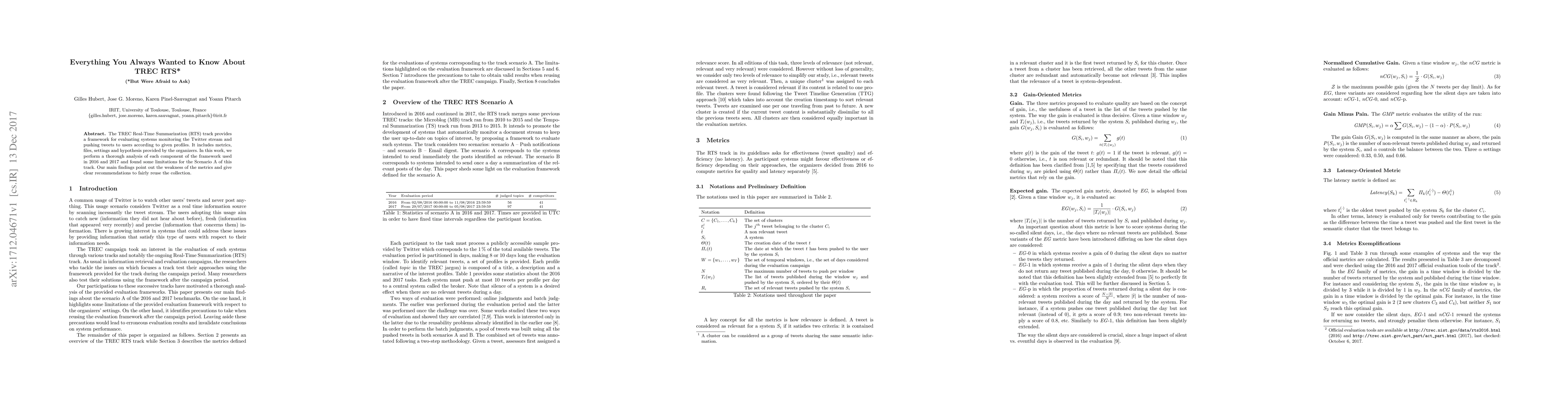 This paper analyzes the TREC Real-Time Summarization (RTS) track, identifying limitations in the 2016 and 2017 frameworks, particularly in Scenario A. The study highlights metric weaknesses and provides recommendations for fair collection reuse.