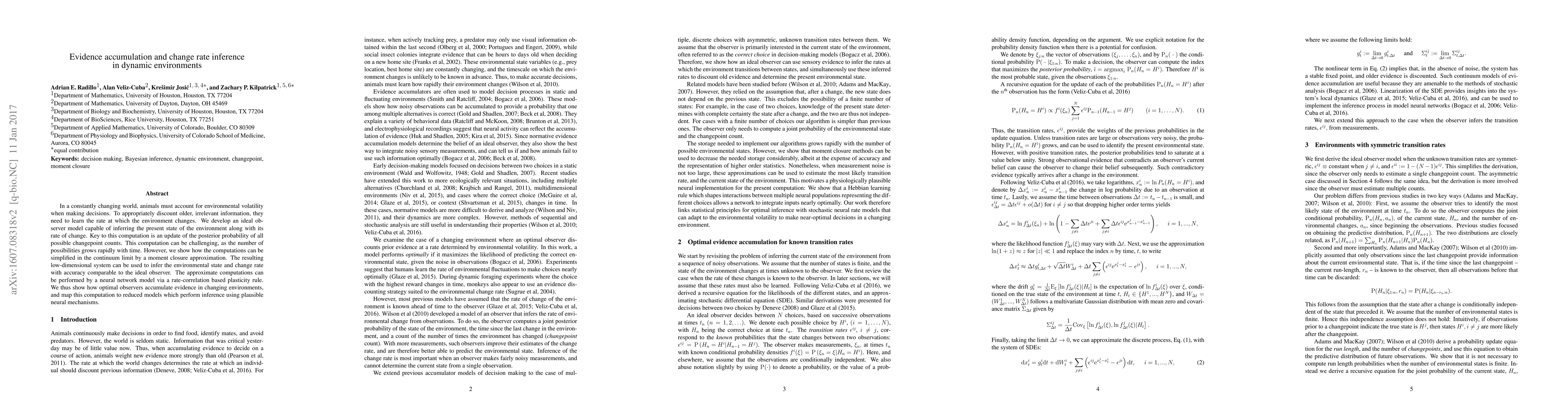 In a constantly changing world, animals must account for environmental volatility when making decisions. To appropriately discount older, irrelevant information, they need to learn the rate at which the environment changes. We develop an ideal observer model capable of inferring the present state of the environment along with its rate of change. Key to this computation is an update of the posterior probability of all possible changepoint counts. This computation can be challenging, as the number of possibilities grows rapidly with time. However, we show how the computations can be simplified in the continuum limit by a moment closure approximation. The resulting low-dimensional system can be used to infer the environmental state and change rate with accuracy comparable to the ideal observer. The approximate computations can be performed by a neural network model via a rate-correlation based plasticity rule. We thus show how optimal observers accumulate evidence in changing environments, and map this computation to reduced models which perform inference using plausible neural mechanisms.
