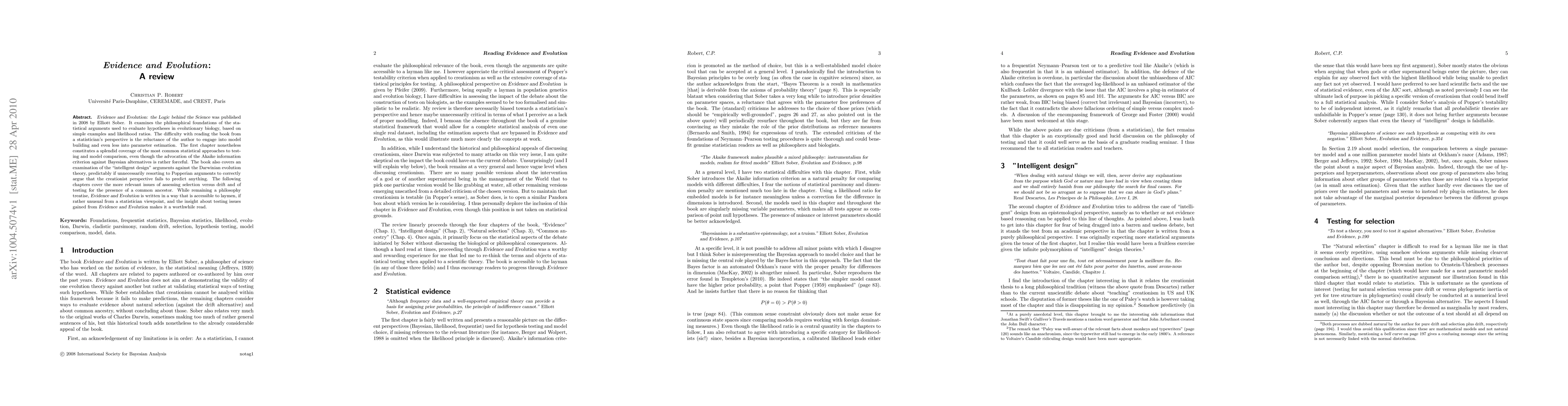 "Evidence and Evolution: the Logic behind the Science" was published in 2008 by Elliott Sober. It examines the philosophical foundations of the statistical arguments used to evaluate hypotheses in evolutionary biology, based on simple examples and likelihood ratios. The difficulty with reading the book from a statistician's perspective is the reluctance of the author to engage into model building and even less into parameter estimation. The first chapter nonetheless constitutes a splendid coverage of the most common statistical approaches to testing and model comparison, even though the advocation of the Akaike information criterion against Bayesian alternatives is rather forceful. The book also covers an examination of the "intelligent design" arguments against the Darwinian evolution theory, predictably if unnecessarily resorting to Popperian arguments to correctly argue that the creationist perspective fails to predict anything. The following chapters cover the more relevant issues of assessing selection versus drift and of testing for the presence of a common ancestor. While remaining a philosophy treatise, Evidence and Evolution is written in a way that is accessible to laymen, if rather unusual from a statistician viewpoint, and the insight about testing issues gained from Evidence and Evolution makes it a worthwhile read.
