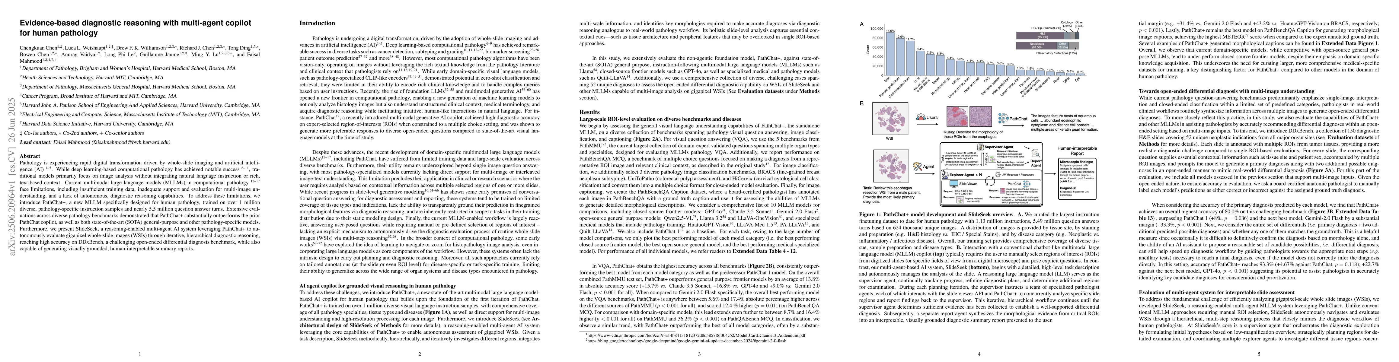 Pathology is experiencing rapid digital transformation driven by whole-slide imaging and artificial intelligence (AI). While deep learning-based computational pathology has achieved notable success, traditional models primarily focus on image analysis without integrating natural language instruction or rich, text-based context. Current multimodal large language models (MLLMs) in computational pathology face limitations, including insufficient training data, inadequate support and evaluation for multi-image understanding, and a lack of autonomous, diagnostic reasoning capabilities. To address these limitations, we introduce PathChat+, a new MLLM specifically designed for human pathology, trained on over 1 million diverse, pathology-specific instruction samples and nearly 5.5 million question answer turns. Extensive evaluations across diverse pathology benchmarks demonstrated that PathChat+ substantially outperforms the prior PathChat copilot, as well as both state-of-the-art (SOTA) general-purpose and other pathology-specific models. Furthermore, we present SlideSeek, a reasoning-enabled multi-agent AI system leveraging PathChat+ to autonomously evaluate gigapixel whole-slide images (WSIs) through iterative, hierarchical diagnostic reasoning, reaching high accuracy on DDxBench, a challenging open-ended differential diagnosis benchmark, while also capable of generating visually grounded, humanly-interpretable summary reports.