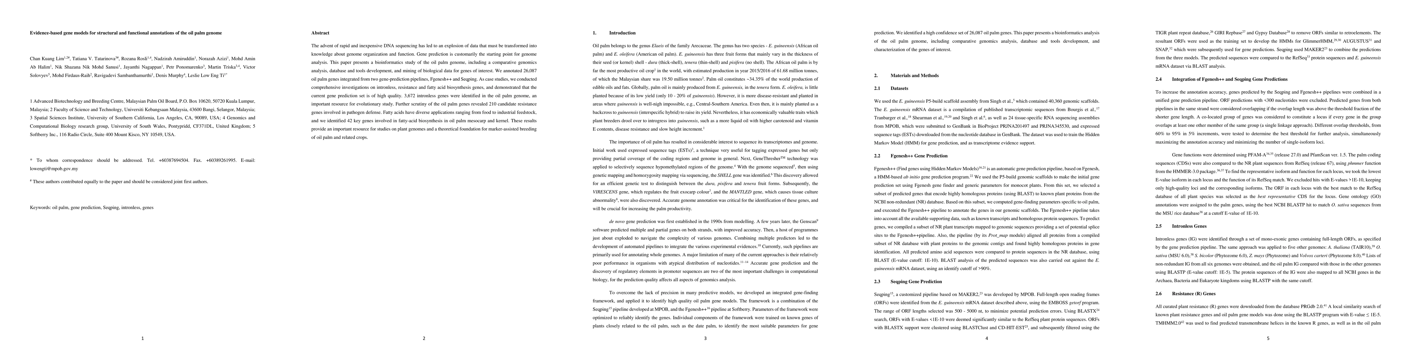The advent of rapid and inexpensive DNA sequencing has led to an explosion of data waiting to be transformed into knowledge about genome organization and function. Gene prediction is customarily the starting point for genome analysis. This paper presents a bioinformatics study of the oil palm genome, including comparative genomics analysis, database and tools development, and mining of biological data for genes of interest. We have annotated 26,059 oil palm genes integrated from two independent gene-prediction pipelines, Fgenesh++ and Seqping. This integrated annotation constitutes a significant improvement in comparison to the preliminary annotation published in 2013. We conducted a comprehensive analysis of intronless, resistance and fatty acid biosynthesis genes, and demonstrated that the high quality of the current genome annotation. 3,658 intronless genes were identified in the oil palm genome, an important resource for evolutionary study. Further analysis of the oil palm genes revealed 210 candidate resistance genes involved in pathogen defense. Fatty acids have diverse applications ranging from food to industrial feedstocks, and we identified 42 key genes involved in fatty acid biosynthesis in oil palm. These results provide an important resource for studies of plant genomes and a theoretical foundation for marker-assisted breeding of oil palm and related crops.