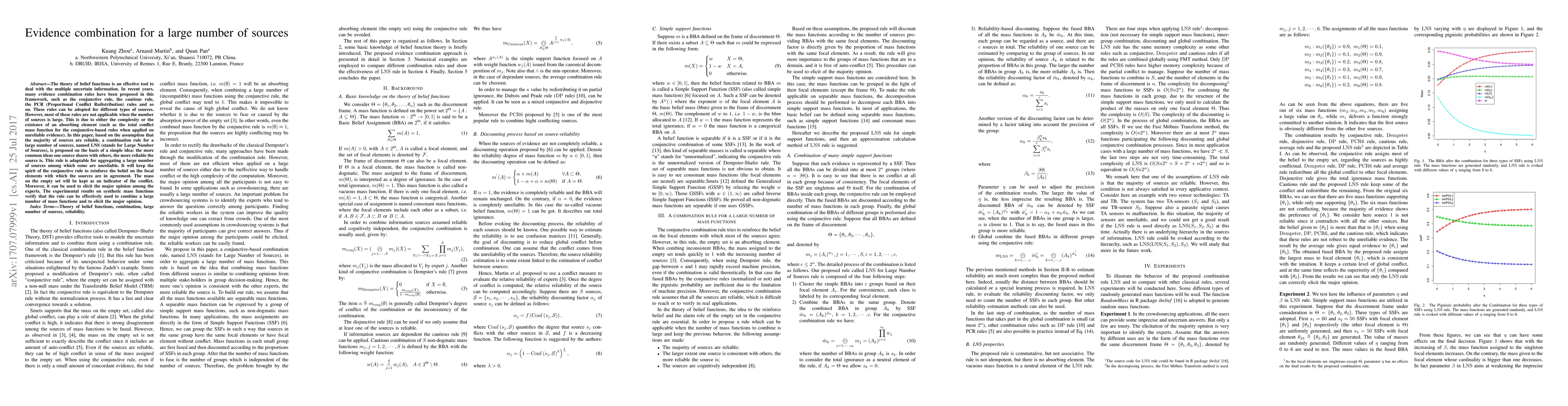 The theory of belief functions is an effective tool to deal with the multiple uncertain information. In recent years, many evidence combination rules have been proposed in this framework, such as the conjunctive rule, the cautious rule, the PCR (Proportional Conflict Redistribution) rules and so on. These rules can be adopted for different types of sources. However, most of these rules are not applicable when the number of sources is large. This is due to either the complexity or the existence of an absorbing element (such as the total conflict mass function for the conjunctive-based rules when applied on unreliable evidence). In this paper, based on the assumption that the majority of sources are reliable, a combination rule for a large number of sources, named LNS (stands for Large Number of Sources), is proposed on the basis of a simple idea: the more common ideas one source shares with others, the morereliable the source is. This rule is adaptable for aggregating a large number of sources among which some are unreliable. It will keep the spirit of the conjunctive rule to reinforce the belief on the focal elements with which the sources are in agreement. The mass on the empty set will be kept as an indicator of the conflict. Moreover, it can be used to elicit the major opinion among the experts. The experimental results on synthetic mass functionsverify that the rule can be effectively used to combine a large number of mass functions and to elicit the major opinion.