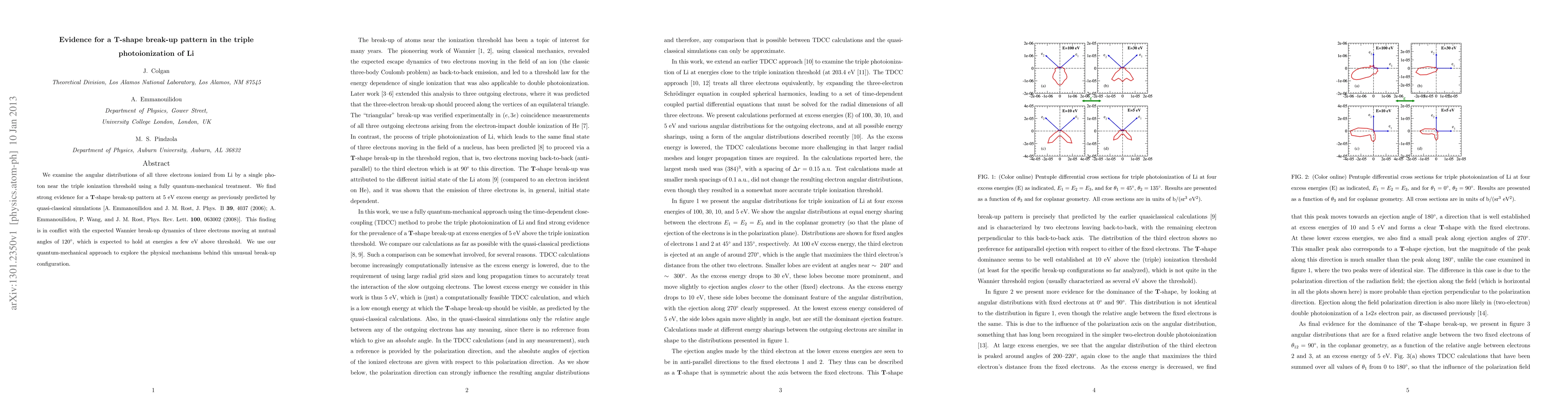 We examine the angular distributions of all three electrons ionized from Li by a single photon near the triple ionization threshold using a fully quantum-mechanical treatment. We find strong evidence for a {\bf T}-shape break-up pattern at 5 eV excess energy as previously predicted by quasi-classical simulations [A. Emmanouilidou and J. M. Rost, \jpb {\bf 39}, 4037 (2006); A. Emmanouilidou, P. Wang, and J. M. Rost, \prl {\bf 100}, 063002 (2008)]. This finding is in conflict with the expected Wannier break-up dynamics of three electrons moving at mutual angles of 120$^{\circ}$, which is expected to hold at energies a few eV above threshold. We use our quantum-mechanical approach to explore the physical mechanisms behind this unusual break-up configuration.