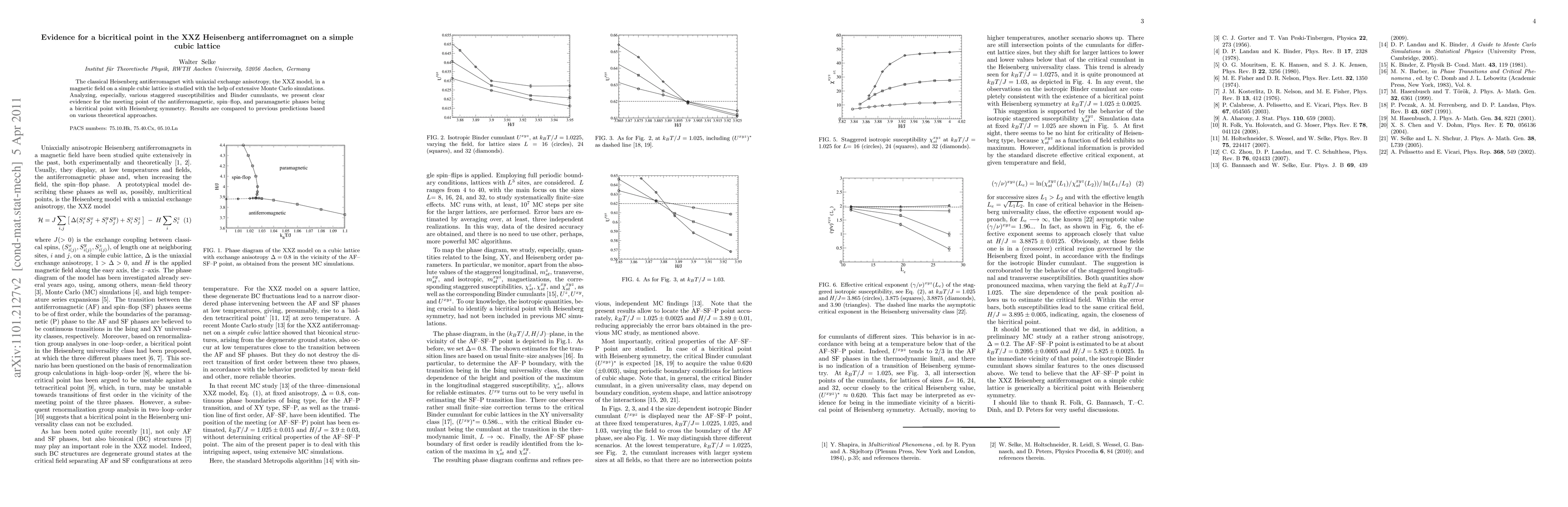 The classical Heisenberg antiferromagnet with uniaxial exchange anisotropy, the XXZ model, in a magnetic field on a simple cubic lattice is studied with the help of extensive Monte Carlo simulations. Analyzing, especially, various staggered susceptibilities and Binder cumulants, we present clear evidence for the meeting point of the antiferromagnetic, spin--flop, and paramagnetic phases being a bicritical point with Heisenberg symmetry. Results are compared to previous predictions based on various theoretical approaches.