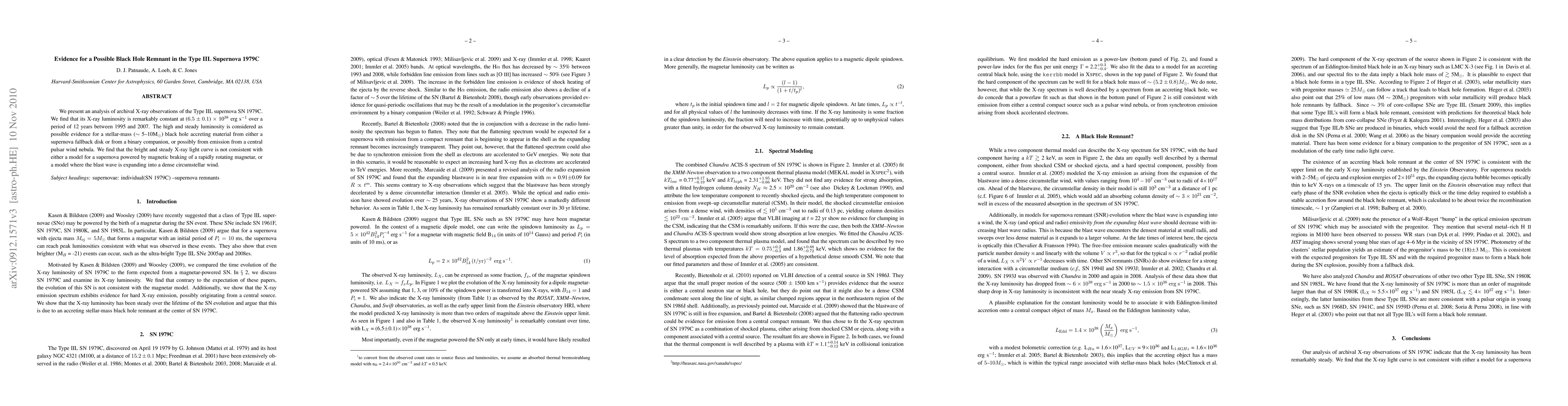 This study analyzes X-ray data of SN 1979C, a Type IIL supernova, finding its luminosity constant at (6.5+/-0.1) x 10^38 erg/s from 1995 to 2007. The steady brightness suggests a stellar-mass black hole accreting from a fallback disk, binary companion, or pulsar wind nebula, contradicting magnetar or dense circumstellar wind models.
