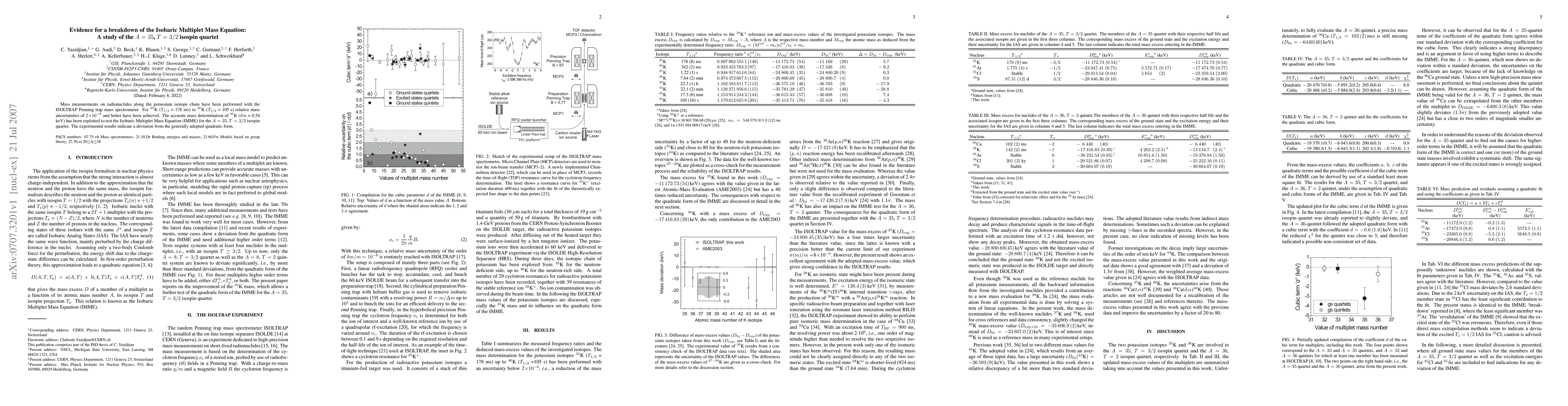 Summary: High-precision mass measurements of potassium isotopes using ISOLTRAP have revealed a deviation from the Isobaric Multiplet Mass Equation for the A=35, T=3/2 isospin quartet, challenging the conventional quadratic form. This suggests a potential breakdown of the IMME in this specific isospin quartet.
