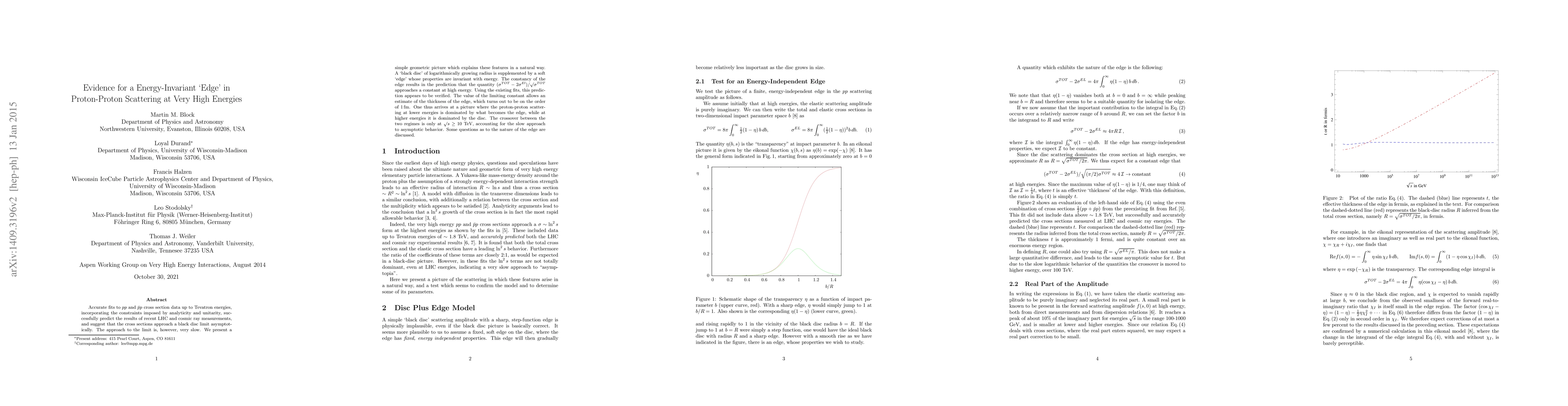Accurate fits to $pp$ and $\bar pp$ cross section data up to Tevatron energies, incorporating the constraints imposed by analyticity and unitarity, successfully predict the results of recent LHC and cosmic ray measurements, and suggest that the cross sections approach a black disc limit asymptotically. The approach to the limit is, however, very slow. We present a simple geometric picture which explains these features in a natural way. A black disc of logarithmically growing radius is supplemented by a soft `edge' whose properties are invariant with energy. The constancy of the edge results in the prediction that the quantity $(\sigma^{TOT}-2\sigma^{El})/\surd\sigma^{TOT}$ approaches a constant at high energy. Using the existing fits, this prediction appears to be verified. The value of the limiting constant allows an estimate of the thickness of the edge, which turns out to be on the order of $1\,{\rm fm}$. One thus arrives at a picture where the proton-proton scattering at lower energies is dominated by what becomes the edge, while at higher energies it is dominated by the disc. The crossover between the two regimes is only at $\surd s\geq $ 10 TeV, accounting for the slow approach to asymptotic behavior. Some questions as to the nature of the edge are discussed.