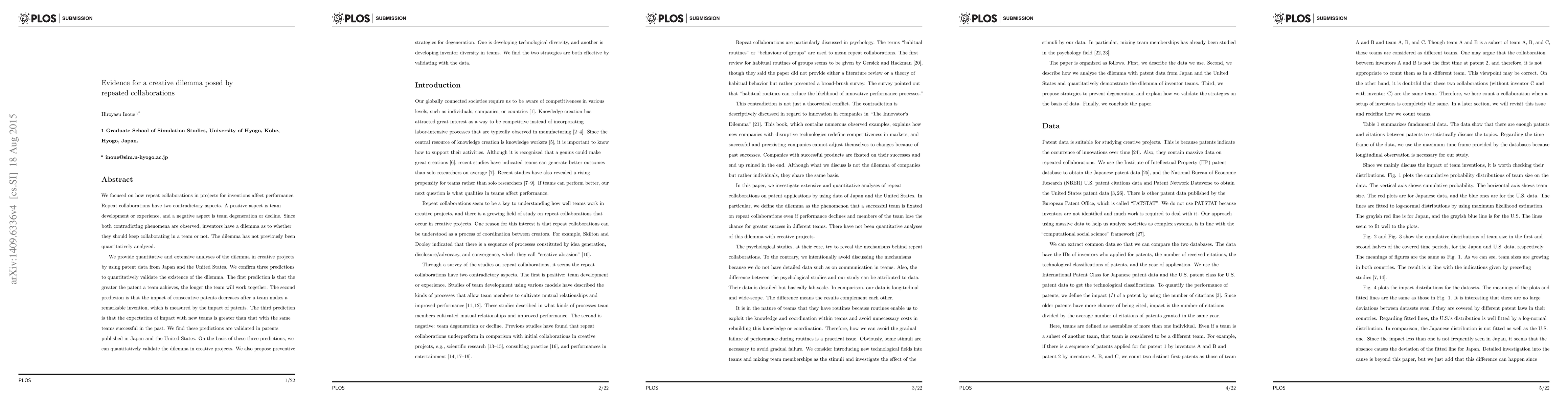 We focused on how repeat collaborations in projects for inventions affect performance. Repeat collaborations have two contradictory aspects. A positive aspect is team development or experience, and a negative aspect is team degeneration or decline. Since both contradicting phenomena are observed, inventors have a dilemma as to whether they should keep collaborating in a team or not. The dilemma has not previously been quantitatively analyzed. We provide quantitative and extensive analyses of the dilemma in creative projects by using patent data from Japan and the United States. We confirm three predictions to quantitatively validate the existence of the dilemma. The first prediction is that the greater the patent a team achieves, the longer the team will work together. The second prediction is that the impact of consecutive patents decreases after a team makes a remarkable invention, which is measured by the impact of patents. The third prediction is that the expectation of impact with new teams is greater than that with the same teams successful in the past. We find these predictions are validated in patents published in Japan and the United States. On the basis of these three predictions, we can quantitatively validate the dilemma in creative projects. We also propose preventive strategies for degeneration. One is developing technological diversity, and another is developing inventor diversity in teams.We find the two strategies are both effective by validating with the data.