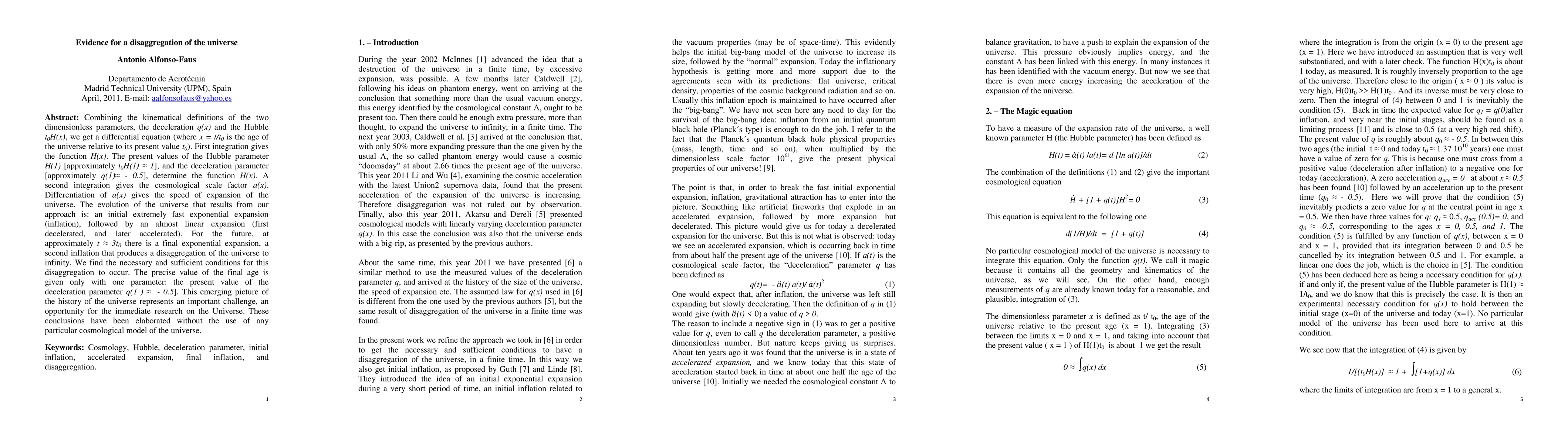 Combining the kinematical definitions of the two dimensionless parameters, the deceleration q(x) and the Hubble t0H(x), we get a differential equation (where x = t/t0 is the age of the universe relative to its present value t0). First integration gives the function H(x). The present values of the Hubble parameter H(1) [approximately t0H(1) \approx 1], and the deceleration parameter [approximately q(1)\approx - 0.5], determine the function H(x). A second integration gives the cosmological scale factor a(x). Differentiation of a(x) gives the speed of expansion of the universe. The evolution of the universe that results from our approach is: an initial extremely fast exponential expansion (inflation), followed by an almost linear expansion (first decelerated, and later accelerated). For the future, at approximately t \approx 3t0 there is a final exponential expansion, a second inflation that produces a disaggregation of the universe to infinity. We find the necessary and sufficient conditions for this disaggregation to occur. The precise value of the final age is given only with one parameter: the present value of the deceleration parameter q(1) \approx - 0.5]. This emerging picture of the history of the universe represents an important challenge, an opportunity for the immediate research on the Universe. These conclusions have been elaborated without the use of any particular cosmological model of the universe.