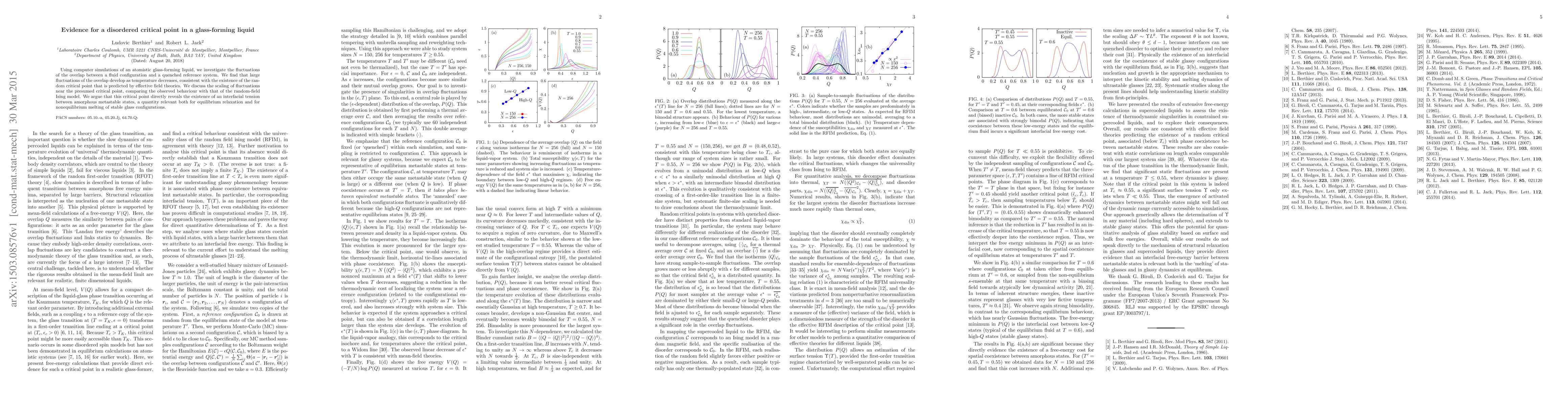 This paper uses computer simulations to demonstrate large fluctuations in a glass-forming liquid as temperature decreases, supporting the existence of a disordered critical point. The study compares these fluctuations to the random-field Ising model, revealing an interfacial tension between amorphous metastable states.