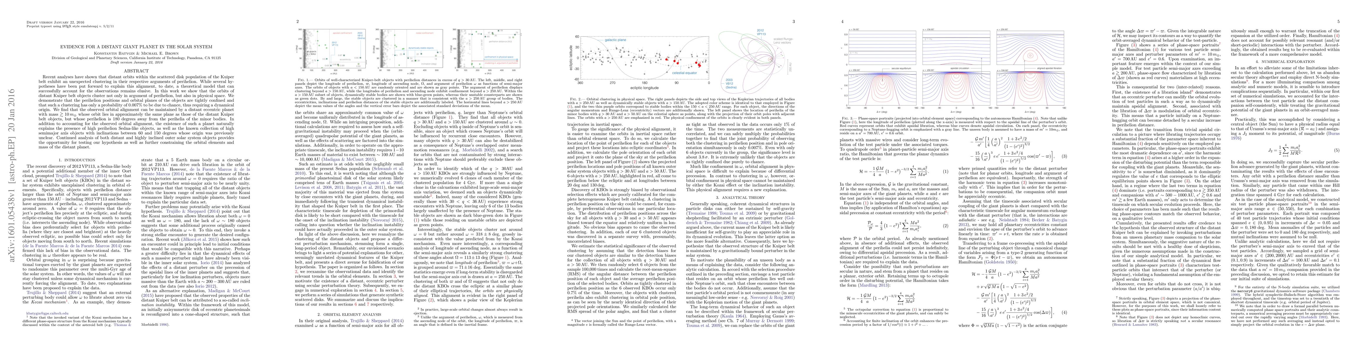 This paper presents evidence for a distant giant planet in the outer solar system, explaining the unexpected clustering of Kuiper belt objects' orbits through the gravitational influence of an eccentric planet with a mass greater than 10 Earth masses. The alignment of these objects' perihelion positions and orbital planes suggests a dynamical origin, rather than chance.