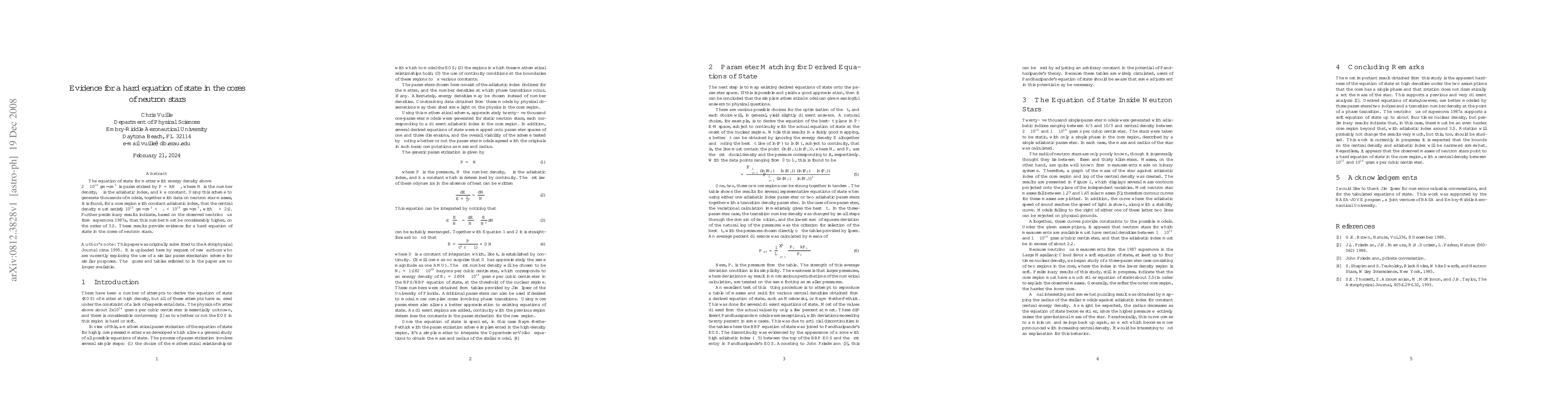 The equation of state for matter with energy density above 2 x10^14 g/cm^3 is parametrized by P = kN^Gamma, where N is the number density, Gamma is the adiabatic index, and k a constant. Using this scheme to generate thousands of models, together with data on neutron star masses, it is found, for a core region with a constant adiabatic index, that the central density must satisfy 10^15 gm/cm^3 < rho_c < 10^16 gm/cm^3, with Gamma > 2.2. Further preliminary results indicate, based on the observed neutrino flux from supernova 1987a, that this number must be considerably higher, on the order of 3.5. These results provide evidence for a hard equation of state in the cores of neutron stars.
