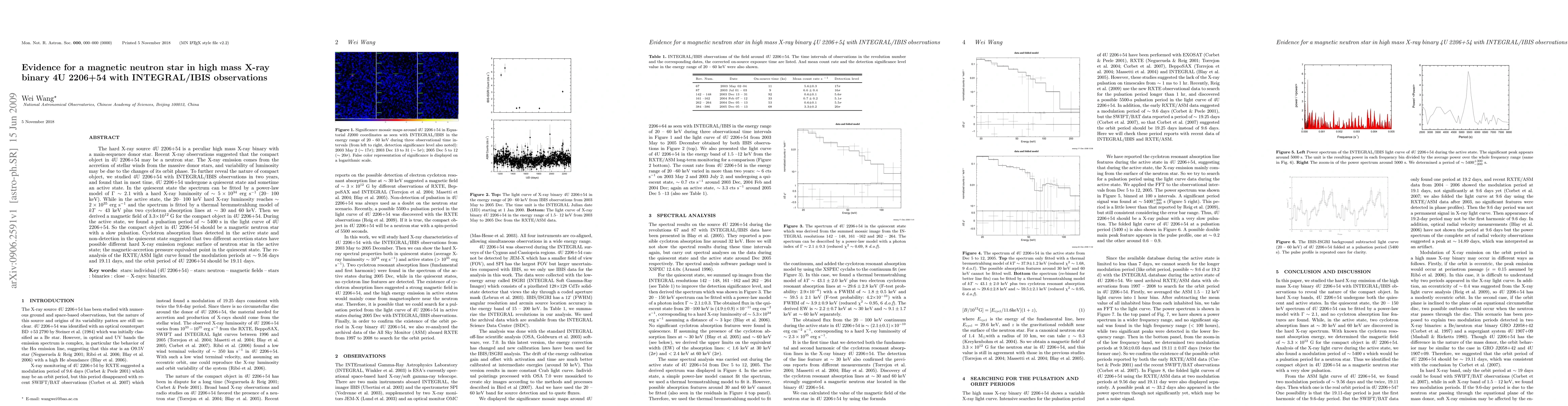 The hard X-ray source 4U 2206+54 is a peculiar high mass X-ray binary with a main-sequence donor star. Recent X-ray observations suggested that the compact object in 4U 2206+54 may be a neutron star. The X-ray emission comes from the accretion of stellar winds from the massive donor stars, and variability of luminosity may be due to the changes of its orbit phase. To further reveal the nature of compact object, we studied 4U 2206+54 with INTEGRAL/IBIS observations in two years, and found that in most time, 4U 2206+54 undergone a quiescent state and sometime an active state. In the quiescent state the spectrum can be fitted by a power-law model of $\Gamma\sim 2.1$ with a hard X-ray luminosity of $\sim 5\times 10^{34}$ erg s$^{-1}$ (20-- 100 keV). While in the active state, the 20-- 100 keV hard X-ray luminosity reaches $\sim 2\times 10^{35}$ erg s$^{-1}$ and the spectrum is fitted by a thermal bremmstrahlung model of $kT\sim 43$ keV plus two cyclotron absorption lines at $\sim$ 30 and 60 keV. Then we derived a magnetic field of 3.3$\times 10^{12}$ G for the compact object in 4U 2206+54. During the active state, we found a pulsation period of $\sim$ 5400 s in the light curve of 4U 2206+54. So the compact object in 4U 2206+54 should be a magnetic neutron star with a slow pulsation. Cyclotron absorption lines detected in the active state and non-detection in the quiescent state suggested that two different accretion states have possible different hard X-ray emission regions: surface of neutron star in the active state; the magnetic-accretion pressure equivalent point in the quiescent state. The re-analysis of the RXTE/ASM light curve found the modulation periods at $\sim 9.56$ days and 19.11 days, and the orbit period of 4U 2206+54 should be 19.11 days.