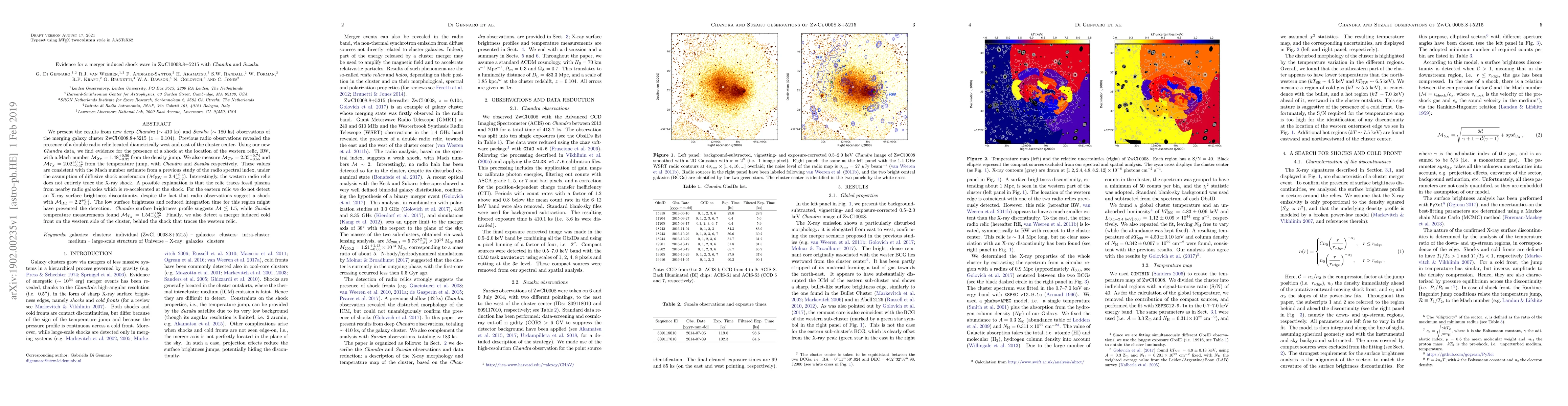 We present the results from new deep {\it Chandra} ($\sim410$~ks) and {\it Suzaku} ($\sim180$ ks) observations of the merging galaxy cluster ZwCl\,0008.8+5215 ($z=0.104$). Previous radio observations revealed the presence of a double radio relic located diametrically west and east of the cluster center. Using our new {\it Chandra} data, we find evidence for the presence of a shock at the location of the western relic, RW, with a Mach number $\mathcal{M}_{S_X}=1.48^{+0.50}_{-0.32}$ from the density jump. We also measure $\mathcal{M}_{T_X}=2.35^{+0.74}_{-0.55}$ and $\mathcal{M}_{T_X}=2.02^{+0.74}_{-0.47}$ from the temperature jump, with {\it Chandra} and {\it Suzaku} respectively. These values are consistent with the Mach number estimate from a previous study of the radio spectral index, under the assumption of diffusive shock acceleration ($\mathcal{M}_{\rm RW}=2.4^{+0.4}_{-0.2}$). Interestingly, the western radio relic does not entirely trace the X-ray shock. A possible explanation is that the relic traces fossil plasma from nearby radio galaxies which is re-accelerated at the shock. For the eastern relic we do not detect an X-ray surface brightness discontinuity, despite the fact that radio observations suggest a shock with $\mathcal{M}_{\rm RE}=2.2^{+0.2}_{-0.1}$. The low surface brightness and reduced integration time for this region might have prevented the detection. {\it Chandra} surface brightness profile suggests $\mathcal{M}\lesssim1.5$, while {\it Suzaku} temperature measurements found $\mathcal{M}_{T_X}=1.54^{+0.65}_{-0.47}$. Finally, we also detect a merger induced cold front on the western side of the cluster, behind the shock that traces the western relic.