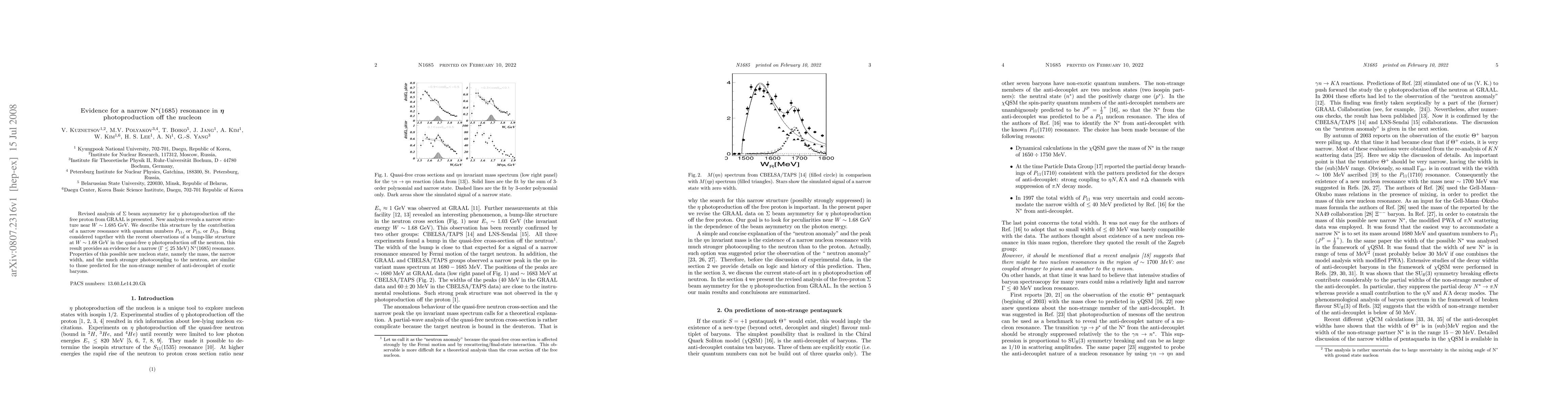 Revised analysis of Sigma beam asymmetry for eta photoproduction off the free proton from GRAAL is presented. New analysis reveals a narrow structure near W ~1.685 GeV. We describe this structure by the contribution of a narrow resonance with quantum numbers P_{11}, or P_{13}, or D_{13}. Being considered together with the recent observations of a bump-like structure at W~1.68 GeV in the quasi-free eta photoproduction off the neutron, this result provides an evidence for a narrow (Gamma < 25 MeV) N*(1685) resonance. Properties of this possible new nucleon state, namely the mass, the narrow width, and the much stronger photocoupling to the neutron, are similar to those predicted for the non-strange member of anti-decouplet of exotic baryons.