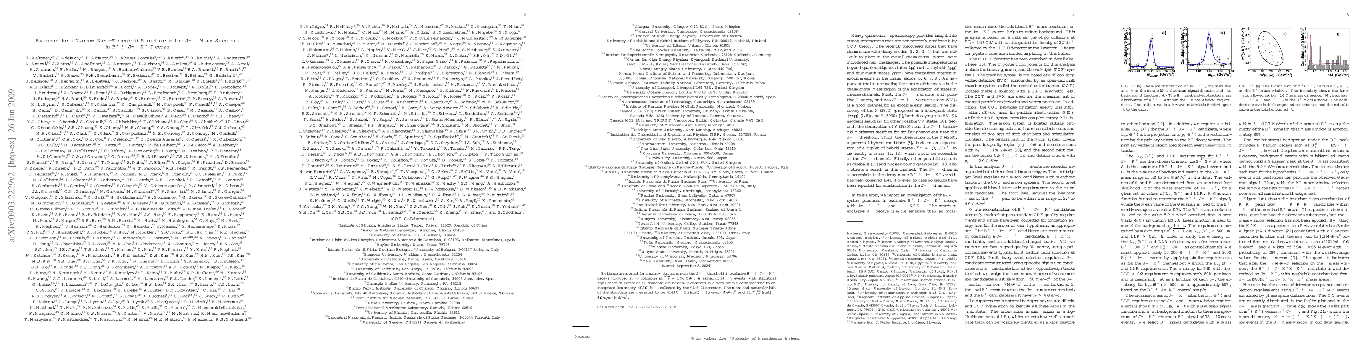 Evidence is reported for a narrow structure near the $J/\psi\phi$ threshold in exclusive $B^+\to J/\psi\phi K^+$ decays produced in $\bar{p} p $ collisions at $\sqrt{s}=1.96 \TeV$. A signal of $14\pm5$ events, with statistical significance in excess of 3.8 standard deviations, is observed in a data sample corresponding to an integrated luminosity of $2.7 \ifb$, collected by the CDF II detector. The mass and natural width of the structure are measured to be $4143.0\pm2.9(\mathrm{stat})\pm1.2(\mathrm{syst}) \MeVcc$ and $11.7^{+8.3}_{-5.0}(\mathrm{stat})\pm3.7(\mathrm{syst}) \MeVcc$.