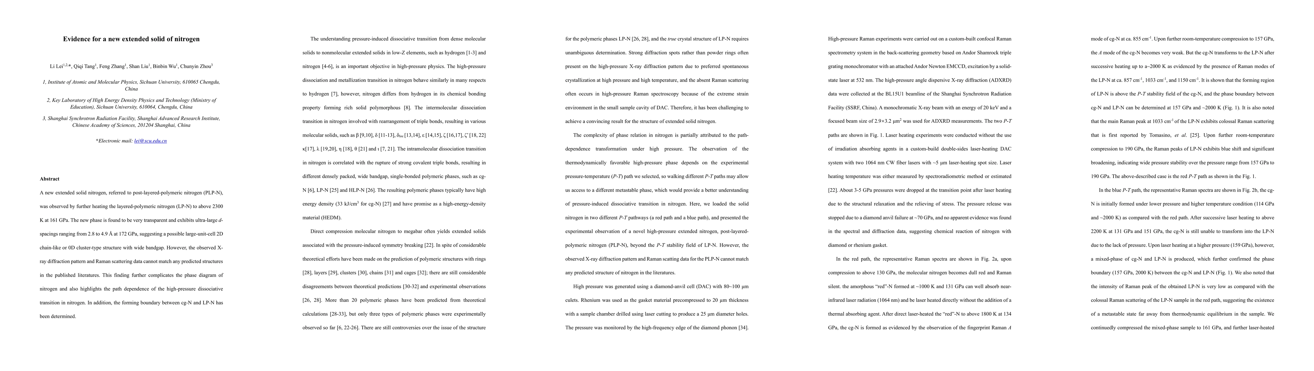 A new extended solid nitrogen, referred to post-layered-polymeric nitrogen (PLP-N), was observed by further heating the layered-polymeric nitrogen (LP-N) to above 2300 K at 161 GPa. The new phase is found to be very transparent and exhibits ultra-large d-spacings ranging from 2.8 to 4.9 {\AA} at 172 GPa, suggesting a possible large-unit-cell 2D chain-like or 0D cluster-type structure with wide bandgap. However, the observed X-ray diffraction pattern and Raman scattering data cannot match any predicted structures in the published literature. This finding further complicates the phase diagram of nitrogen and also highlights the path dependence of the high-pressure dissociative transition in nitrogen. In addition, the forming boundary between cg-N and LP-N has been determined.