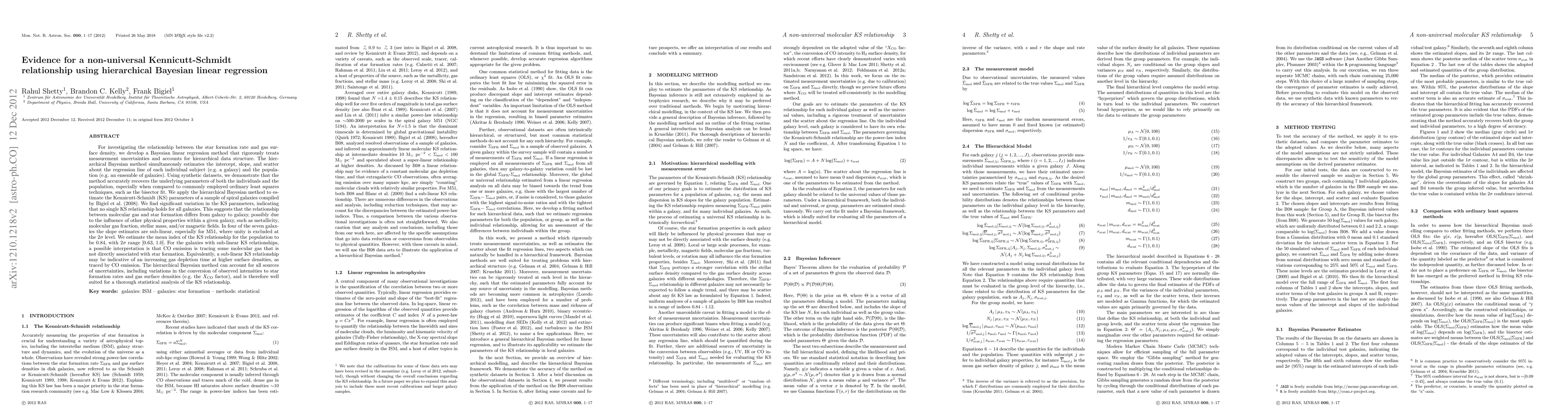 For investigating the relationship between the star formation rate and gas surface density, we develop a Bayesian linear regression method that rigorously treats measurement uncertainties and accounts for hierarchical data structure. The hierarchical method simultaneously estimates the intercept, slope, and scatter about the regression line of each individual subject and the population. Using synthetic datasets, we demonstrate that the method recovers the underlying parameters of both the individuals and the population, especially when compared to commonly employed ordinary least squares techniques, such as the bisector fit. We apply the hierarchical method to estimate the Kennicutt-Schmidt (KS) parameters of a sample of spiral galaxies compiled by Bigiel et al. (2008). We find significant variation in the KS parameters, indicating that no single relationship holds for all galaxies. This suggests that the relationship between molecular gas and star formation differs between galaxies, possibly due to the influence of other properties within a given galaxy, such as metallicity, molecular gas fraction, or stellar mass. In four galaxies the slope estimates are sub-linear (at the 95% level). We estimate the mean index of the KS relationship for the population to be 0.84, with 95% range [0.63, 1.0]. For the galaxies with sub-linear KS relationships, a possible interpretation is that CO emission is tracing some molecular gas that is not directly associated with star formation. Equivalently, a sub-linear KS relationship may be indicative of an increasing gas depletion time at higher surface densities, as traced by CO emission. The Bayesian method can account for all sources of uncertainties, including variations in the conversion of observed intensities to star formation rates and gas surface densities, and is therefore well suited for a thorough statistical analysis of the KS law.