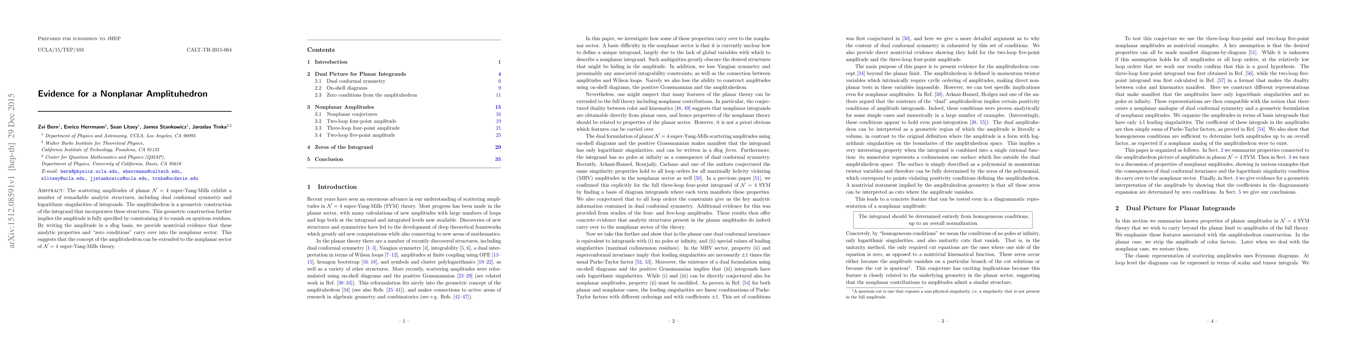 The scattering amplitudes of planar N = 4 super-Yang-Mills exhibit a number of remarkable analytic structures, including dual conformal symmetry and logarithmic singularities of integrands. The amplituhedron is a geometric construction of the integrand that incorporates these structures. This geometric construction further implies the amplitude is fully specified by constraining it to vanish on spurious residues. By writing the amplitude in a dlog basis, we provide nontrivial evidence that these analytic properties and "zero conditions" carry over into the nonplanar sector. This suggests that the concept of the amplituhedron can be extended to the the nonplanar sector of N = 4 super-Yang-Mills theory.