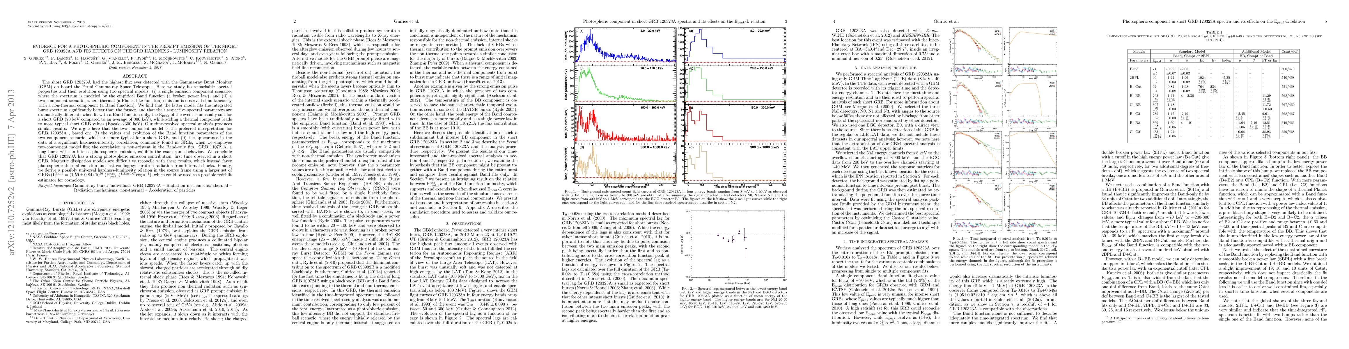 The short GRB 120323A had the highest flux ever detected with the Fermi/GBM. Here we study its remarkable spectral properties and their evolution using two spectral models: (i) a single emission component scenario, where the spectrum is modeled by the empirical Band function, and (ii) a two component scenario, where thermal (Planck-like) emission is observed simultaneously with a non-thermal component (a Band function). We find that the latter model fits the integrated burst spectrum significantly better than the former, and that their respective spectral parameters are dramatically different: when fit with a Band function only, the Epeak of the event is unusually soft for a short GRB, while adding a thermal component leads to more typical short GRB values. Our time-resolved spectral analysis produces similar results. We argue here that the two-component model is the preferred interpretation for GRB 120323A, based on: (i) the values and evolution of the Band function parameters of the two component scenario, which are more typical for a short GRB, and (ii) the appearance in the data of a significant hardness-intensity correlation, commonly found in GRBs, when we employee two-component model fits; the correlation is non-existent in the Band-only fits. GRB 110721A, a long burst with an intense photospheric emission, exhibits the exact same behavior. We conclude that GRB 120323A has a strong photospheric emission contribution, first time observed in a short GRB. Magnetic dissipation models are difficult to reconcile with these results, which instead favor photospheric thermal emission and fast cooling synchrotron radiation from internal shocks. Finally, we derive a possibly universal hardness-luminosity relation in the source frame using a larger set of GRBs L,i=(1.59+/-0.84).10^50 (Epeak,i)^(1.33+/-0.07) erg/s), which could be used as a possible redshift estimator for cosmology.