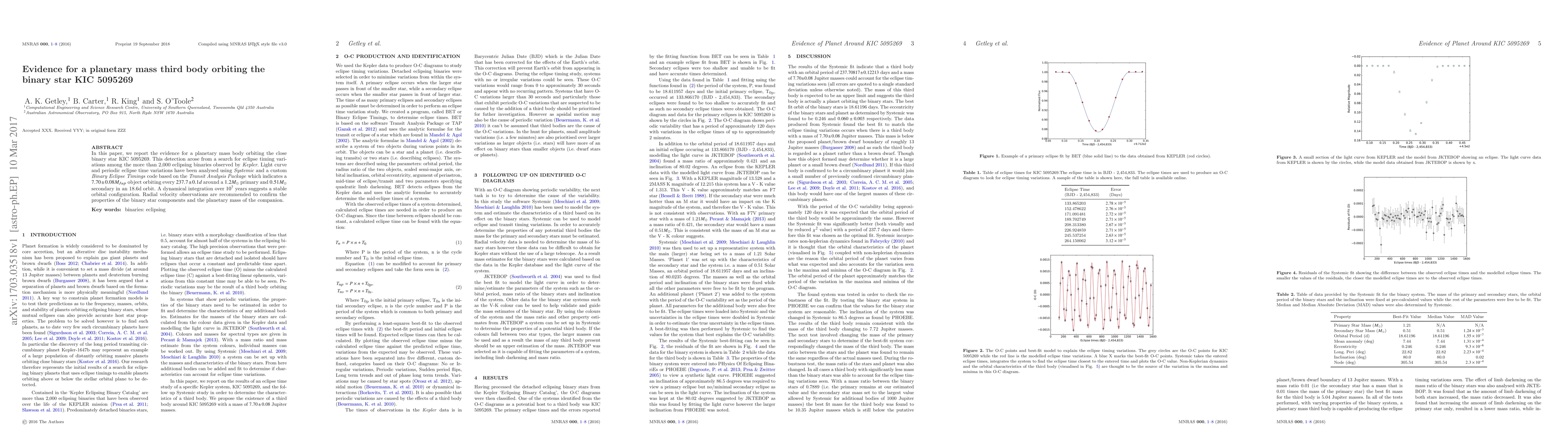 In this paper, we report the evidence for a planetary mass body orbiting the close binary star KIC 5095269. This detection arose from a search for eclipse timing variations among the more than 2,000 eclipsing binaries observed by Kepler. Light curve and periodic eclipse time variations have been analysed using Systemic and a custom Binary Eclipse Timings code based on the Transit Analysis Package which indicates a $7.70\pm0.08M_{Jup}$ object orbiting every $237.7\pm0.1d$ around a $1.2M_\odot$ primary and $0.51M_\odot$ secondary in an 18.6d orbit. A dynamical integration over $10^7$ years suggests a stable orbital configuration. Radial velocity observations are recommended to confirm the properties of the binary star components and the planetary mass of the companion.