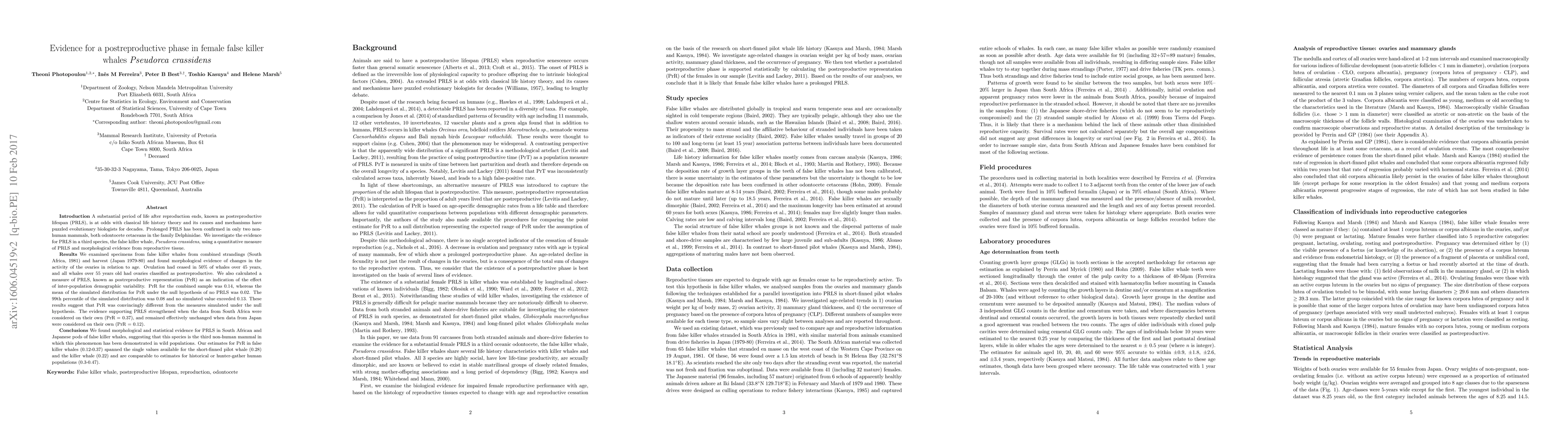 A substantial period of life after reproduction ends, known as postreproductive lifespan (PRLS), is at odds with classical life history theory. Prolonged PRLS has been confirmed in only two non-human mammals, both odontocete cetaceans. We investigate the evidence for PRLS in a third species, the false killer whale, Pseudorca crassidens, using a quantitative measure of PRLS and morphological evidence from reproductive tissue. We examined specimens from false killer whales from combined strandings (South Africa, 1981) and harvest (Japan 1979-80) and found morphological evidence of changes in the activity of the ovaries in relation to age. Ovulation had ceased in 50% of whales over 45 years, and all whales over 55 years old had ovaries classified as postreproductive. We also calculated a measure of PRLS, known as postreproductive representation (PrR) as an indication of the effect of inter-population demographic variability. PrR for the combined sample was 0.14, whereas the mean of the simulated distribution for PrR under the null hypothesis of no PRLS was 0.02. The 99th percentile of the simulated distribution was 0.08 and no simulated value exceeded 0.13. These results suggest that PrR was convincingly different from the measures simulated under the null hypothesis. We found morphological and statistical evidence for PRLS in South African and Japanese pods of false killer whales, suggesting that this species is the third non-human mammal in which this phenomenon has been demonstrated in wild populations. Our estimates for PrR in false killer whales (0.12-0.37) spanned the single values available for the short-finned pilot whale (0.28) and the killer whale (0.22) and are comparable to estimates for historical or hunter-gather human populations (0.3-0.47).