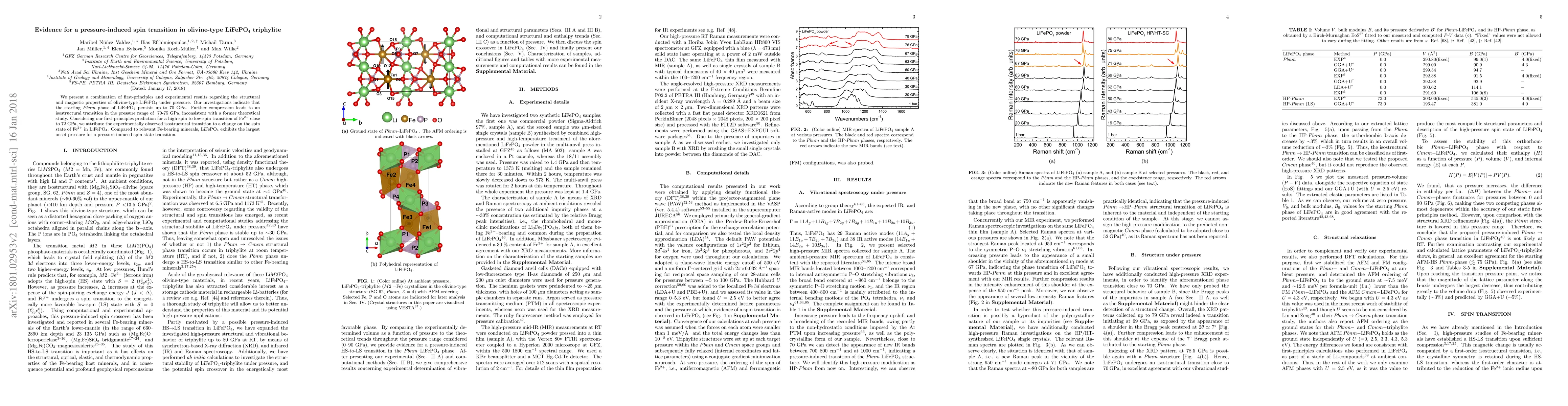 We present a combination of first-principles and experimental results regarding the structural and magnetic properties of olivine-type LiFePO$_4$ under pressure. Our investigations indicate that the starting $Pbnm$ phase of LiFePO$_4$ persists up to 70 GPa. Further compression leads to an isostructural transition in the pressure range of ~70-75 GPa, inconsistent with a former theoretical study. Considering our first-principles prediction for a high-spin to low-spin transition of Fe$^{2+}$ close to 72 GPa, we attribute the experimentally observed isostructural transition to a change on the spin state of Fe$^{2+}$ in LiFePO$_4$. Compared to relevant Fe-bearing minerals, LiFePO$_4$ exhibits the largest onset pressure for a pressure-induced spin state transition.