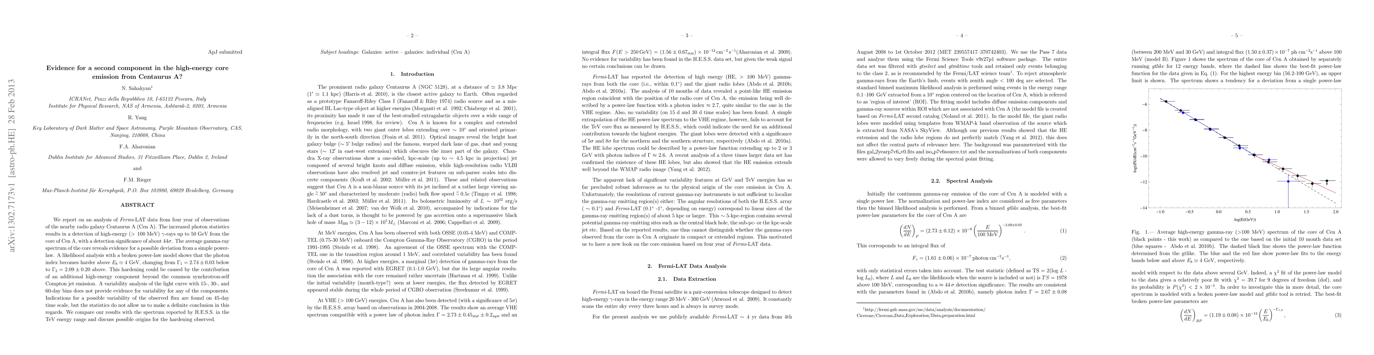 We report on an analysis of \fermi data from four year of observations of the nearby radio galaxy Centaurus A (Cen A). The increased photon statistics results in a detection of high-energy ($>\:100$ MeV) $\gamma$-rays up to 50 GeV from the core of Cen A, with a detection significance of about 44$\sigma$. The average gamma-ray spectrum of the core reveals evidence for a possible deviation from a simple power-law. A likelihood analysis with a broken power-law model shows that the photon index becomes harder above $E_b \simeq 4$ GeV, changing from $\Gamma_1=2.74\pm0.03$ below to $\Gamma_2=2.09\pm0.20$ above. This hardening could be caused by the contribution of an additional high-energy component beyond the common synchrotron-self Compton jet emission. A variability analysis of the light curve with 15-, 30-, and 60-day bins does not provide evidence for variability for any of the components. Indications for a possible variability of the observed flux are found on 45-day time scale, but the statistics do not allow us to make a definite conclusion in this regards. We compare our results with the spectrum reported by H.E.S.S. in the TeV energy range and discuss possible origins for the hardening observed.