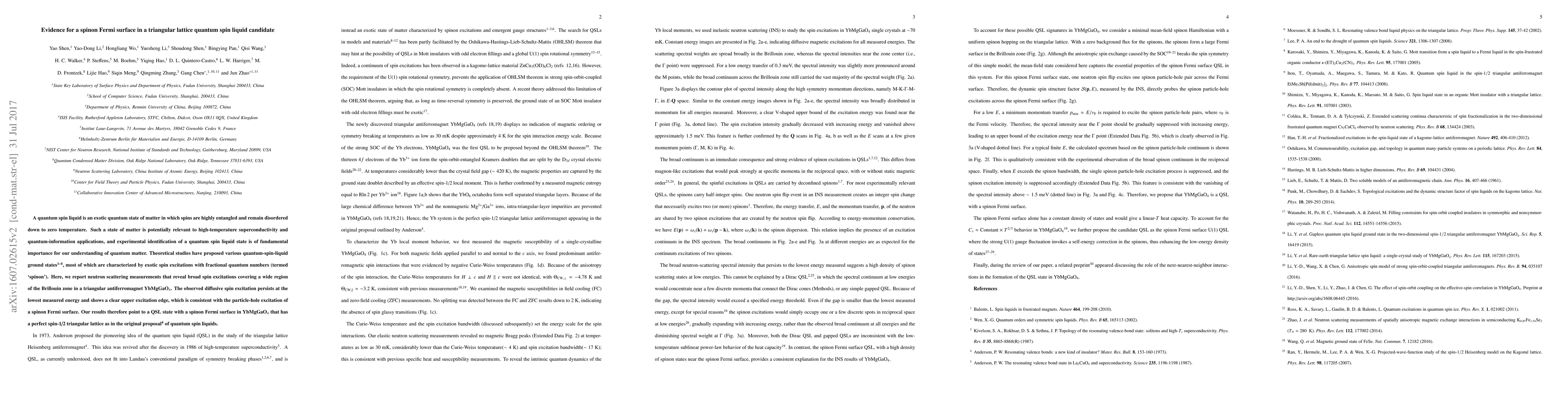 This paper reports neutron scattering measurements revealing broad spin excitations in YbMgGaO4, indicating a spinon Fermi surface, which supports the presence of a quantum spin liquid state in this triangular lattice material. The findings suggest a potential quantum spin liquid with fractional spin excitations, relevant for high-temperature superconductivity and quantum information applications.