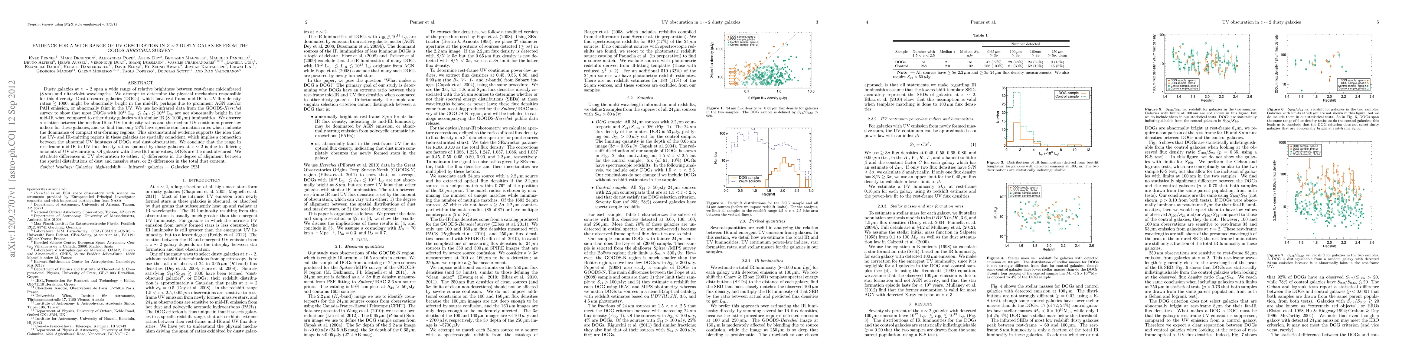 The research examines dusty galaxies at z ~ 2, finding a wide range in UV obscuration. Using Herschel data, it reveals that Dust-Obscured Galaxies (DOGs) aren't exceptionally bright in the mid-IR compared to others with similar IR luminosities. The study suggests that differences in UV obscuration stem from varied dust-star alignment or total dust content.